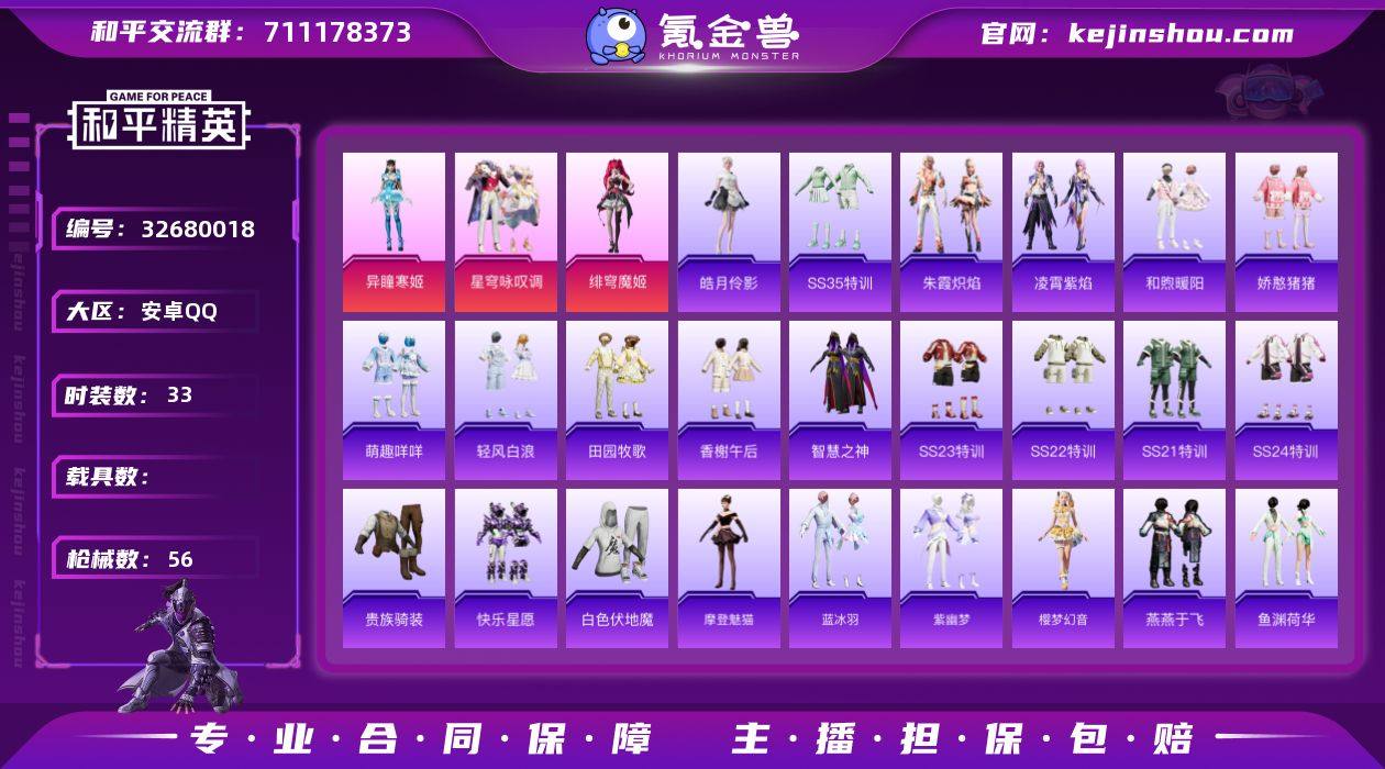 【和平精英】3粉装,6特效枪,0载具,历史最高段位:超级王牌2星 王牌印记1次 热力值:33782,76套装,119枪械,119装备,58战备;套装:角色-异瞳寒姬,角色-绯穹魔姬,套装-星穹咏叹调,套装-青年教官,套装-红色运动,套装-白色伏地魔,套装-竞技名士,套装-酒红色名流,套装-长空猛禽,套装-旭日情侣,套装-贵族骑装,套装-特殊使命,套装-春日漫步,套装-龙腾端午,套装-街头潮人,套装-魅力单车,套装-森林游猎者,套装-都市魅力,套装-酷潮明星,套装-青涩时光,套装-缤纷果语,套装-滨海厨神,套装-龙魂突击队,套装-鹤鸣,套装-智慧之神,套装-战术大师,套装-狙击之神,套装-牛气冲天,套装-快乐星愿,套装-SS21特训,套装-萌趣咩咩,套装-娇憨猪猪,套装-玉兔迎春,套装-SS22特训,套装-和煦暖阳,套装-田园牧歌,套装-轻风白浪,套装-光之冒险,套装-SS23特训,套装-香榭午后,套装-王牌教练,套装-柠萌假日,套装-SS24特训,套装-龟仙人,套装-SS25特训,套装-龙的传人,套装-恋语绒绒,套装-街头风暴,套装-异域银装,角色-摩登魅猫,套装-SS30特训,套装-暗夜风云,套装-SS31特训,套装-鱼渊荷华,套装-燕燕于飞,套装-智谋强哥,套装-紫幽梦,套装-SS33特训,套...