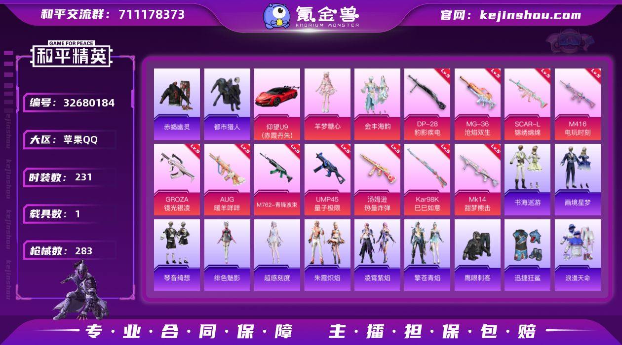苹果 手Q-3粉装-15特效枪-1载具-0粉色飞行器-85870热力值-17王牌印记-231套装-283枪皮 【热门品类】:绝对防御上衣,套装-浪漫天命,套装-赤蝎幽灵,套装-都市猎人,套装-小丑鱼,套装-龟仙人,套装-暗影哥特,角色-Mark.06,套装-红熊茄茄 【粉色套装】:粉装-金丰海韵,角色-羊梦糖心,角色-辉云木星 【粉色枪皮等级】:SCAR-L-锦绣绵绵(五级),M416-电玩时刻(五级),GROZA-镜光银凌(五级),AUG-暖羊咩咩(五级),M762-青锋波束(五级),ACE32-萌骑漫游(二级),UMP45-量子极限(五级),汤姆逊-热量炸弹(五级),AKS-74U-森灵之息(五级),Kar98K-巳巳如意(五级),M24-虎痴许褚(三级),Mk14-甜梦熊击(五级),Mk14-福马献瑞(五级),DP-28-豹影疾电(五级),MG-36-沧焰双生(五级) 【粉色载具】:仰望U9(赤霞丹朱) 【粉色枪皮】:SCAR-L-锦绣绵绵,M416-电玩时刻,GROZA-镜光银凌,AUG-暖羊咩咩,M762-青锋波束,ACE32-萌骑漫游,UMP45-量子极限,汤姆逊-热量炸弹,AKS-74U-森灵之息,Kar98K-巳巳如意,M24-虎痴许褚,Mk14-甜梦熊击,Mk14-福马献瑞,DP-28-豹影疾电,MG-36-沧焰双生 【粉色降落伞】:绝对恒星降落伞,香水柠檬降落伞,星之彼岸降落伞,天星战神降落伞,初号机 觉醒V...