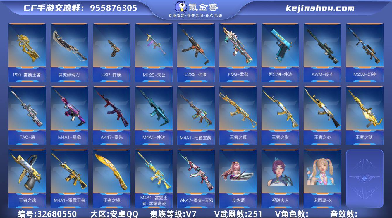 精品V7/安卓/实名:可修改🔥9王者+9三国!5把辅瞄枪,赠送连体王者黄金射手座小号🔥【M4A1-雷霆王者-冰霜奇迹,星象+按键,奉先-无双,仲达套+现代战场,M4A1-七色宝葫】🔥【TAC-慈,AWM-妙才,王尊,王锋,王影,王心套,盖,孟获,仲康套,天公,幻神,P90-雷暴王者,王狱】🔥【步练师,宋雨琦-X,祝融夫人】🔥LV.118个级巅峰大元首,251个不重复的V➕271万化【具体的枪械详情以截图为准、截图展示段位不代表实际段位,如赛季更新等不可抗拒因素发生变化、时限道具和各种活动不保证所剩时间和是否参与过】安全保证金平台合作商,售候无忧!