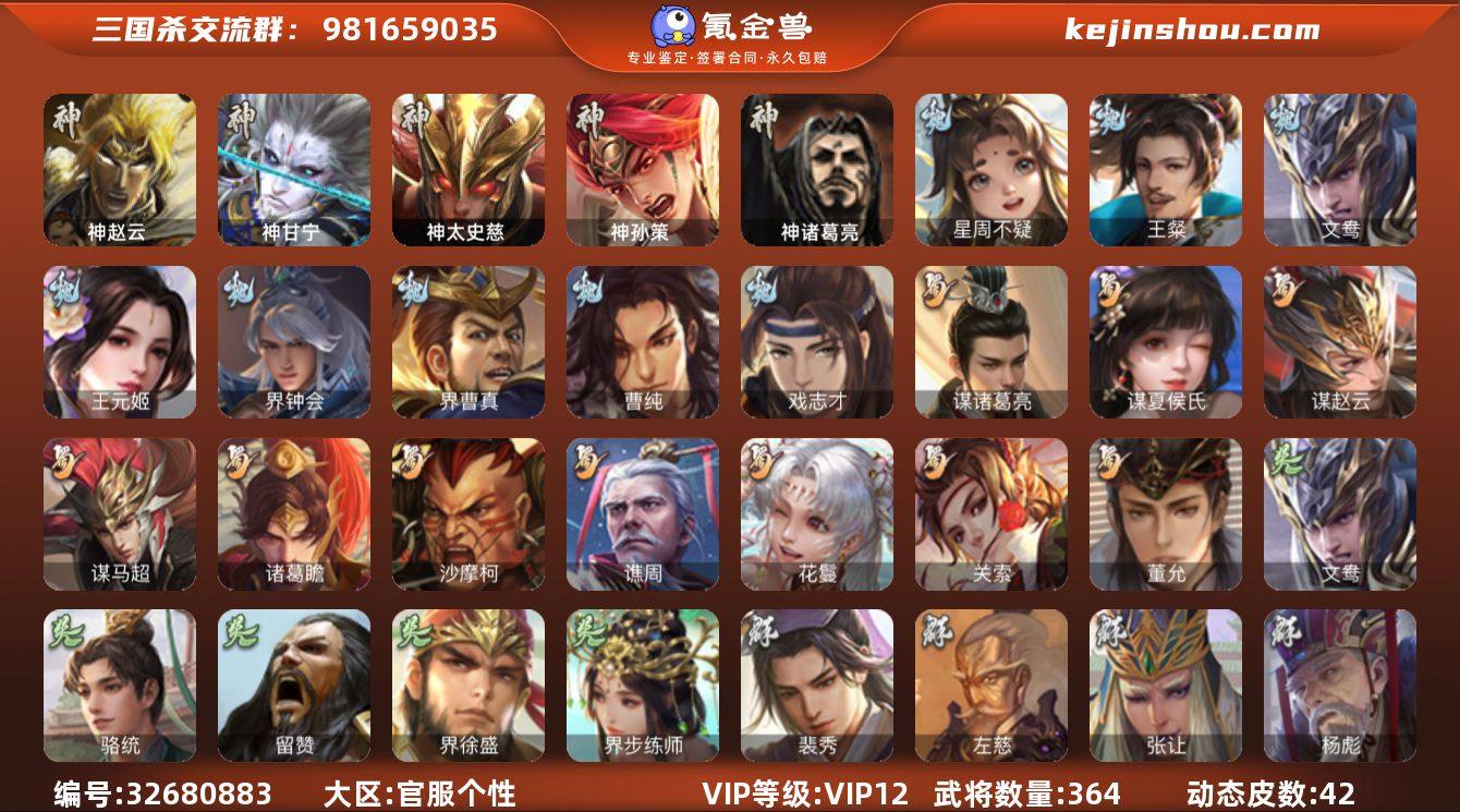 【420】官阶:大将军;VIP等级:VIP12;史诗武将数量:42;动态皮肤数量:42;武将总数:364;史诗宝珠数量:18;将魂数量:7761;神将:7;魏国史诗武将:18;蜀国史诗武将:10;吴国史诗武将:4;群史诗武将:16