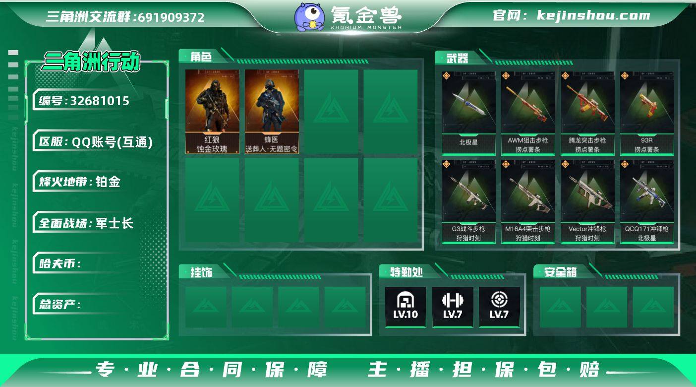 总资产:331.8M 9干员外观 2近战传说 36传说枪械 哈夫币:5.068K 可二次 可修改实名 【烽火地带段位】铂金 【全面战场段位】军士长 【干员外观】蛊-不羁人生,威龙-凌霄戍卫,乌鲁鲁-荒原猎手,红狼-蚀金玫瑰,骇爪-维什戴尔,红狼-电锯惊魂,蜂医-送葬人·无题密令(S5),深蓝-不破誓约(S6),露娜-金牌射手(S7) 【传说武器皮肤】近战-信条,近战-北极星,M7战斗步枪-棱镜攻势S2(典藏),P90冲锋枪-信条,腾龙突击步枪-死神玫瑰,AWM狙击步枪-捞点薯条,腾龙突击步枪-捞点薯条,93R-捞点薯条,勇士冲锋枪-能天使-午夜邮差,M250通用机枪-骑士之心,M14射手步枪-电锯惊魂,SCAR-H战斗步枪-启航,ASh-12战斗步枪-鹅鸭杀,QCQ171冲锋枪-鹅鸭杀,QJB201轻机枪-鹅鸭杀,SG552突击步枪-运动员,.357左轮-缄花,SR-25射手步枪-缄花,M14射手步枪-缄花,SMG-45冲锋枪-锦绣,K437突击步枪-锦绣,AKM突击步枪-锦绣,47突击步枪-悠然茶歇,QCQ171冲锋枪-不羁人生,G3战斗步枪-狩猎时刻,M14射手步枪-蛮荒,QBZ95-1突击步枪-凌霄戍卫,腾龙突击步枪-马年祥瑞,G18-马年祥瑞,M16A4突击步枪-狩猎时刻,Vector冲锋枪-狩猎时刻,M4A1突击步枪-蚀金玫瑰,K437突击步枪-北极星,QCQ171冲锋枪-北极星,M4A1突击步枪-阿米娅,CAR-15突击步枪-阿米...
