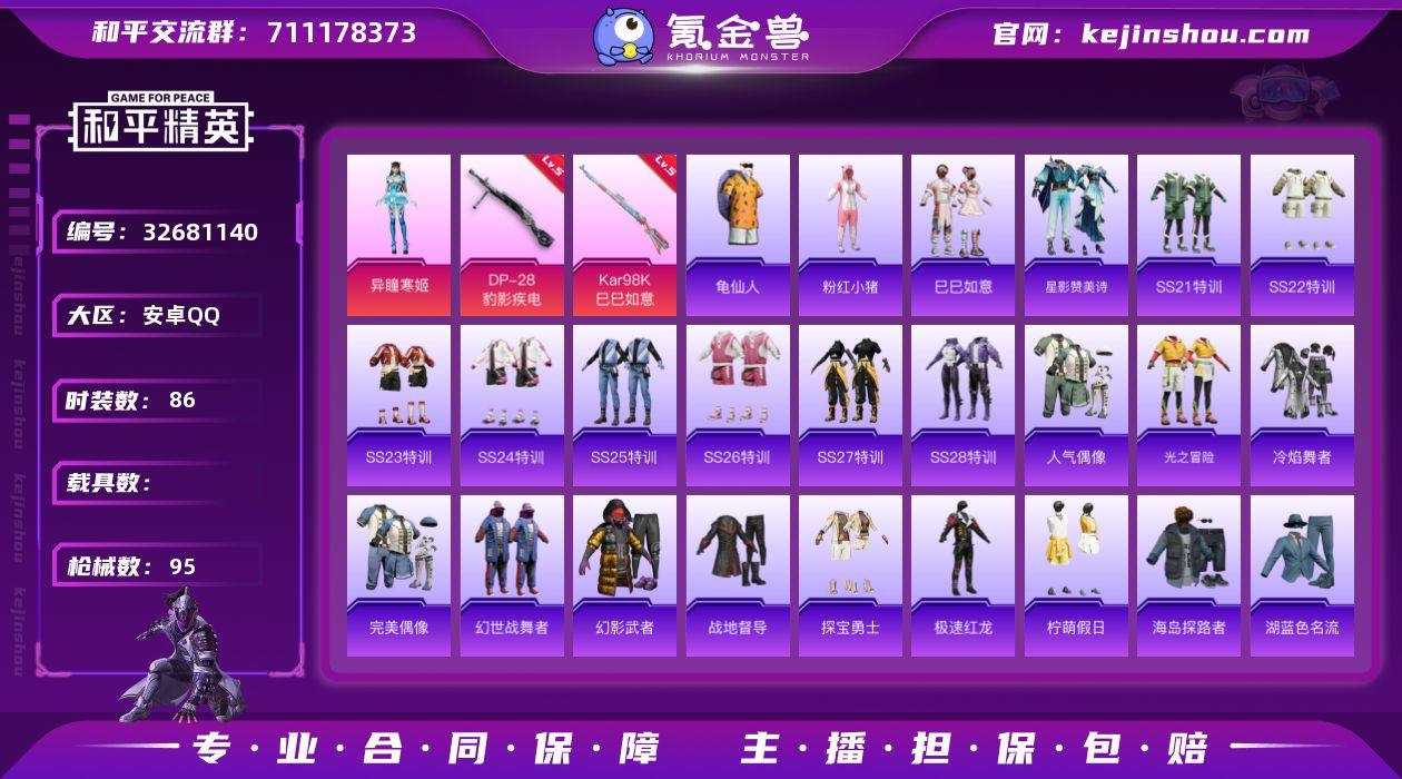 安卓 手Q-1粉装-3特效枪-0载具-0粉色飞行器-26241热力值-2王牌印记-86套装-95枪皮 【热门品类】:套装-龟仙人,套装-粉红小猪 【粉色套装】:角色-异瞳寒姬 【粉色枪皮等级】:Kar98K-巳巳如意(五级),Mk14-福马献瑞(五级),DP-28-豹影疾电(五级) 【粉色枪皮】:Kar98K-巳巳如意,Mk14-福马献瑞,DP-28-豹影疾电 【粉色降落伞】:环太平洋降落伞,音爆索尼克降落伞,幻彩电音降落伞 【稀有套装】:套装-龟仙人,套装-巳巳如意,套装-马上来财,套装-星影赞美诗,角色-曹焱兵 【稀有枪皮】:AKM-彩虹符号,AKM-破晓战魂,AKM-龙的传人,M16A4-莲影清波,SCAR-L-红色方程式,M416-糯团青竹,M416-红色方程式,M416-蓝色火焰,GROZA-2B战斗服款,GROZA-彩虹符号,AUG-天降萌叽,AUG-耀粉歌者,QBZ-彩虹符号,M762-天降萌叽,Mk47-洛神天依,AC-VAL-天降萌叽,蜜獾-天降萌叽,UZI-啾咪啾咪,UZI-炫彩节奏,UZI-红色方程式,UMP45-涂山之恋,汤姆逊-天降萌叽,汤姆逊-炫彩节奏,汤姆逊-耀粉歌者,P90-巳巳如意,Kar98K-彩虹符号,Kar98K-红色方程式,SKS-夜灯,VSS-彩虹符号,Mini14-耀粉歌者,S686-生命誓言,S686-红色方程式,S686-巳巳如意,S12K-玩趣呆呆,S12K-破晓战魂,S12K...