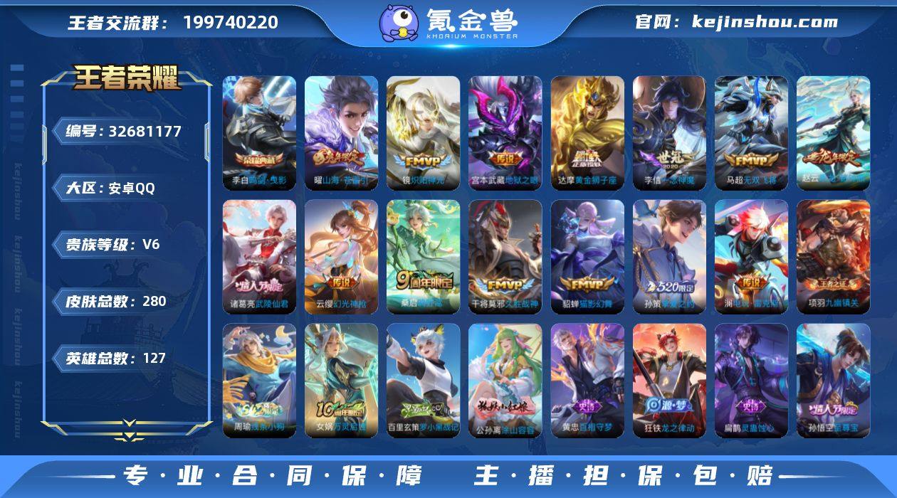 安卓Q-V6-最强王者段位-127英雄-280皮肤-1典藏皮肤-14传说-89史诗 【荣耀典藏】:李白鸣剑曳影 【传说皮肤】:云缨幻光神枪,桑启鸣野蒿,赵云乘龙铭钟鼎,澜电玩雷克斯,曜山海苍雷引,马超无双飞将,孙策挚爱之约,镜炽阳神光,李信一念神魔,貂蝉猫影幻舞,干将莫邪久胜战神,达摩黄金狮子座,诸葛亮武陵仙君,宫本武藏地狱之眼 【限定皮肤】:姜子牙天穹之誓,狄仁杰阴阳师,赵云皇家上将,墨子神迹守卫,孙尚香蔷薇恋人,庄周高山流水,高渐离玩趣恶龙,钟无艳王者之锤,芈月幻夜卜梦,元歌无心,夏侯惇朔风刀,甄姬游园惊梦,典韦穷奇,马可波罗暗影游猎,马可波罗山海玄木吟,狄仁杰魔术师,狄仁杰万华元夜,达摩沙漠行僧,项羽海滩派对,老夫子醍醐杖,老夫子航海奇遇记,程咬金演武夺筹,韩信飞衡,韩信傲雪梅枪,兰陵王金庭之子,花木兰默契交锋,孙悟空至尊宝,孙悟空孙行者,牛魔御旌,李元芳云中旅人,钟馗驱傩正仪,雅典娜黎明之约,鬼谷子原初探秘者,鬼谷子五谷丰年,诸葛亮武陵仙君,黄忠火炮绅士,铠青龙志,苏烈千军破阵,百里玄策原初追逐者,弈星混沌棋,梦奇顽趣,沈梦溪大漠名商,明世隐疑决卦,裴擒虎李小龙,裴擒虎擒涛扼浪,狂铁御狮,云中君纤云弄...