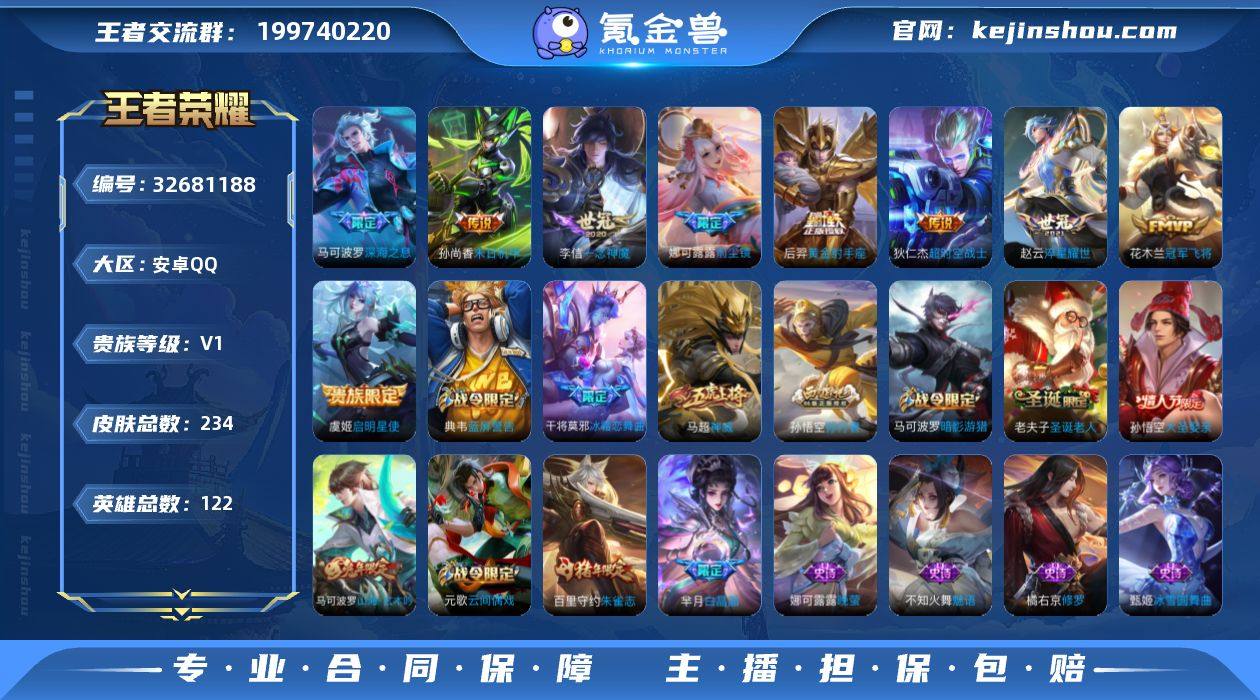 安卓Q-V0-尊贵铂金IV段位-122英雄-234皮肤-1典藏英雄-9传说-72史诗 【英雄全皮】:娜可露露全皮 【荣耀典藏】:武则天英雄 【传说皮肤】:娜可露露前尘镜,马可波罗深海之息,赵云淬星耀世,虞姬启明星使,李信一念神魔,花木兰冠军飞将,后羿黄金射手座,孙尚香末日机甲,狄仁杰超时空战士 【限定皮肤】:白起狰,狄仁杰阴阳师,虞姬凯尔特女王,赵云皇家上将,墨子神迹守卫,妲己热情桑巴,嬴政白昼王子,孙尚香蔷薇恋人,鲁班七号乒乒小将,庄周高山流水,阿轲迷踪丽影,扁鹊炼金王,芈月重明,芈月白晶晶,芈月幻夜卜梦,吕布猎兽之王,周瑜赤莲之焰,元歌云间偶戏,夏侯惇朔风刀,甄姬游园惊梦,曹操烛龙,典韦穷奇,典韦蓝屏警告,马可波罗暗影游猎,马可波罗深海之息,马可波罗山海玄木吟,狄仁杰魔术师,狄仁杰万华元夜,达摩星际陆战队,达摩沙漠行僧,项羽海滩派对,老夫子圣诞老人,老夫子醍醐杖,老夫子航海奇遇记,程咬金演武夺筹,刘邦夺宝奇兵,王昭君午后时光,兰陵王驯魔猎人,兰陵王金庭之子,娜可露露前尘镜,亚瑟潮玩骑士王,孙悟空大圣娶亲,孙悟空孙行者,牛魔御旌,后羿圣弓游侠,李元芳云中旅人,虞姬启明星使,钟馗驱傩正仪,女娲朔望之晖,干将莫邪...