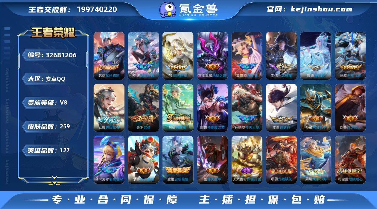 安卓Q-V8-最强王者段位-127英雄-259皮肤-1典藏皮肤-19传说-66史诗 【英雄全皮】:夏洛特全皮 【荣耀典藏】:韩信弑枪猎影 【传说皮肤】:桑启鸣野蒿,亚连落雪白狼,露娜霜月吟,云缨鹤归松栖,马可波罗妄想实况,夏洛特浮生妄,孙悟空齐天大圣,李白诗剑行,马超无双飞将,孙策末日机甲,铠绛天战甲,镜炽阳神光,虞姬启明星使,关羽武圣,李信一念神魔,刘备时之恋人,梦奇胖达荣荣,貂蝉仲夏夜之梦,宫本武藏地狱之眼 【限定皮肤】:姜子牙天穹之誓,狄仁杰阴阳师,赵云皇家上将,赵云引擎之心,嬴政优雅恋人,孙尚香蔷薇恋人,元歌云间偶戏,甄姬游园惊梦,马可波罗暗影游猎,马可波罗妄想实况,狄仁杰魔术师,狄仁杰万华元夜,达摩沙漠行僧,项羽海滩派对,老夫子醍醐杖,关羽武圣,王昭君午后时光,亚瑟潮玩骑士王,孙悟空齐天大圣,李元芳匿光侦查者,李元芳云中旅人,虞姬启明星使,钟馗驱傩正仪,雅典娜单词大作战,蔡文姬繁星吟游,鬼谷子原初探秘者,苏烈千军破阵,弈星混沌棋,沈梦溪星空之诺,沈梦溪大漠名商,明世隐疑决卦,裴擒虎天狼狩猎者,裴擒虎李小龙,裴擒虎擒涛扼浪,狂铁电玩高手,云中君纤云弄巧,猪八戒西部大镖客,嫦娥拒霜思,嫦娥暖冬兔眠,西施...