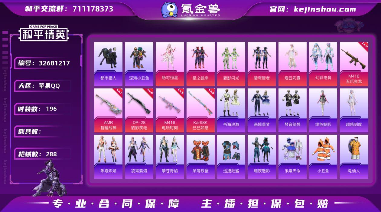 苹果 手Q-6粉装-5特效枪-0载具-3粉色飞行器-84149热力值-6王牌印记-196套装-288枪皮 【热门品类】:套装-浪漫天命,套装-都市猎人,套装-深海小丑鱼,套装-小丑鱼,套装-龟仙人,套装-粉红小猪 【粉色套装】:角色-绝对恒星,粉装-星之彼岸,粉装-碧影闪光,粉装-碧穹智者,角色-烟云彩露,粉装-幻彩电音 【粉色枪皮等级】:M416-五爪金龙(七级),M416-电玩时刻(五级),Kar98K-巳巳如意(五级),AMR-智耀战神(七级),DP-28-豹影疾电(五级) 【粉色枪皮】:M416-五爪金龙,M416-电玩时刻,Kar98K-巳巳如意,AMR-智耀战神,DP-28-豹影疾电 【粉色飞行器】:炫彩糖果飞行器,万象金身飞行器,终晖之翼飞行器 【粉色降落伞】:绝对恒星降落伞,甜蜜誓约降落伞,星之彼岸降落伞,洛神天依降落伞,圣堂之誓降落伞,宇宙意志降落伞,千金淑猫降落伞,临安公主降落伞,金蛇镇世降落伞,鬼刀降落伞,星穹咏叹调降落伞,幻彩电音降落伞,荧海星豚降落伞,灵猫魔法师降落伞,炫彩糖果降落伞 【稀有套装】:套装-龟仙人,角色-超感刻度,套装-雪国风尚,套装-炫彩糖果,套装-雏菊兔兔,套装-萝兰蝴蝶,套装-燕燕于飞,套装-鱼渊荷华,角色-海琴烟,套装-蓝冰羽,套装-星渊小夜曲,套装-朱霞...