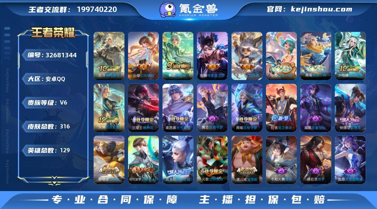 安卓Q-V6-最强王者段位-129英雄-316皮肤-1典藏英雄-5传说-83史诗 【英雄全皮】:鲁班大师全皮,蒙恬全皮,影全皮 【荣耀典藏】:武则天英雄 【传说皮肤】:后羿神树通天,云缨幻光神枪,桑启鸣野蒿,李元芳飞鸢探春,貂蝉仲夏夜之梦 【限定皮肤】:白起狰,姜子牙天穹之誓,狄仁杰阴阳师,虞姬凯尔特女王,赵云皇家上将,嬴政优雅恋人,嬴政白昼王子,孙尚香蔷薇恋人,鲁班七号狮舞东方,钟无艳王者之锤,钟无艳超时空战士,孙膑天狼运算者,扁鹊奇幻香踪,芈月重明,吕布猎兽之王,周瑜赤莲之焰,元歌云间偶戏,元歌无心,夏侯惇朔风刀,甄姬落雪兰心,曹操烛龙,典韦穷奇,马可波罗山海玄木吟,狄仁杰魔术师,狄仁杰万华元夜,达摩星际陆战队,达摩沙漠行僧,项羽海滩派对,老夫子醍醐杖,程咬金演武夺筹,兰陵王驯魔猎人,兰陵王金庭之子,花木兰默契交锋,亚瑟潮玩骑士王,孙悟空至尊宝,孙悟空孙行者,牛魔御旌,李元芳银河之约,李元芳云中旅人,钟馗神迹守卫,钟馗驱傩正仪,杨戬潮玩骑兵,干将莫邪胡桃夹子,雅典娜单词大作战,雅典娜黎明之约,蔡文姬繁星吟游,太乙真人饕餮,鬼谷子原初探秘者,鬼谷子五谷丰年,苏烈千军破阵,百里玄策原初追逐者,弈星混沌棋,沈梦...