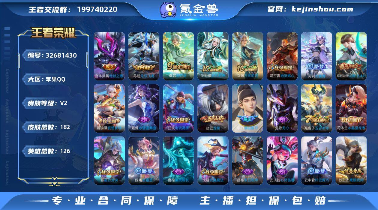 苹果Q-V2-至尊星耀IV段位-126英雄-182皮肤-3传说-57史诗 【英雄全皮】:孙权全皮 【传说皮肤】:桑启鸣野蒿,马超无双飞将,宫本武藏地狱之眼 【限定皮肤】:蔡文姬夏日便利店,大乔绒语心约,虞姬夏日便利店,姜子牙天穹之誓,杨戬破阵退雄兵,李白谪仙醉月,狄仁杰阴阳师,赵云皇家上将,赵云龙胆,元歌无心,甄姬游园惊梦,马可波罗山海玄木吟,狄仁杰魔术师,项羽海滩派对,王昭君午后时光,兰陵王金庭之子,李元芳云中旅人,鬼谷子五谷丰年,百里玄策原初追逐者,沈梦溪大漠名商,裴擒虎擒涛扼浪,狂铁电玩高手,云中君纤云弄巧,嫦娥拒霜思,嫦娥暖冬兔眠,西施玲珑珍味,鲁班大师探海日志,桑启海盐诗旅,暃星界游侠,戈娅驭风魔法,艾琳流音漫舞,司空震地狱燃心,阿古朵江河有灵,张良古海寻踪,蒙犽百解令,蒙恬荣光圣徽,高渐离燃音魔法,妲己灵卜魔法,鬼谷子天穹祈灯,姬小满妄想食味,沈梦溪龙舞盛年,刘邦剑破天穹,上官婉儿群星魔术团,程咬金群星魔术团,镜青焰无极,项羽苍威无极,刘备异域游侠,芈月浮光幕影,周瑜熔金海岸 【年限皮肤】:马可波罗山海玄木吟 【赛季限定】:兰陵王金庭之子,沈梦溪大漠名商,李元芳云中旅人,桑启海盐诗旅,裴擒虎擒涛扼...