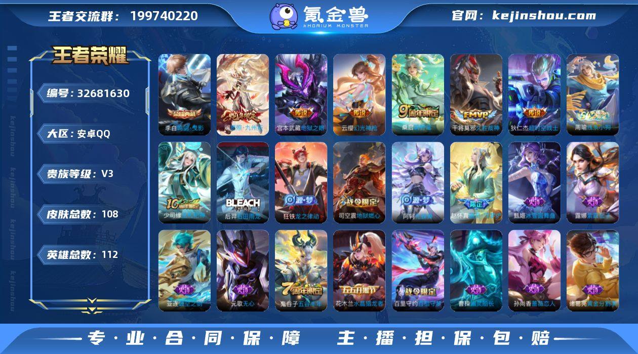 安卓Q-V3-最强王者段位-112英雄-108皮肤-1典藏皮肤-6传说-33史诗 【英雄全皮】:空空儿全皮 【荣耀典藏】:李白鸣剑曳影 【传说皮肤】:澜愿照九州拓,云缨幻光神枪,桑启鸣野蒿,干将莫邪久胜战神,宫本武藏地狱之眼,狄仁杰超时空战士 【限定皮肤】:姜子牙天穹之誓,狄仁杰阴阳师,孙尚香蔷薇恋人,元歌无心,甄姬落雪兰心,项羽海滩派对,李元芳银河之约,鬼谷子五谷丰年,百里玄策原初追逐者,鲁班大师探海日志,艾琳流音漫舞,司空震地狱燃心,阿古朵江河有灵,张良古海寻踪,鬼谷子天穹祈灯,沈梦溪龙舞盛年,刘邦剑破天穹,程咬金群星魔术团,周瑜熔金海岸 【年限皮肤】:澜愿照九州拓 【赛季限定】:鲁班大师探海日志,张良古海寻踪,鬼谷子天穹祈灯,刘邦剑破天穹,姜子牙天穹之誓,东皇太一噬灭天穹,太乙真人谧流熔炉,钟馗虚灵犬护,亚瑟荣光之誓,百里玄策原初追逐者,牛魔星界战将 【战令限定】:李元芳银河之约,甄姬落雪兰心,司空震地狱燃心,艾琳流音漫舞,亚连破空之剑,孙悟空神迹守卫,百里守约百相守梦,老夫子百相守梦,周瑜线条小狗 【史诗皮肤】:周瑜线条小狗,少司缘巫礼祀神,后羿石田雨龙,狂铁龙之律动,阿轲化蝶舞,赵怀真器灵浮梦炉,牛魔星...