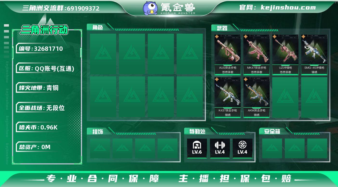 实名: 不可修改 烽火地带段位: 青铜 全面战场段位: 无段位 总资产: 100 哈夫币: 962 传说武器皮肤: SMG-45冲锋枪-锦绣,K437突击步枪-锦绣,AKM突击步枪-锦绣,MK47突击步枪-悠然茶歇,AUG突击步枪-悠然茶歇,UZI冲锋枪-悠然茶歇