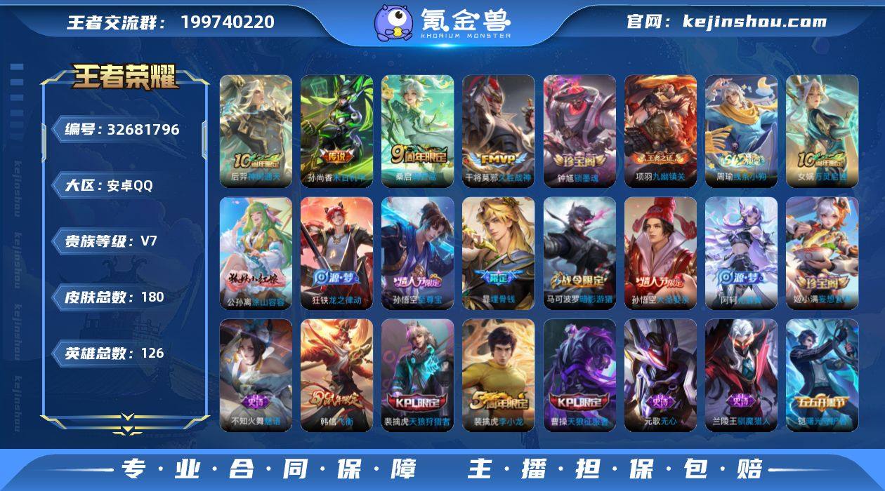 安卓Q-V7-最强王者段位-126英雄-180皮肤-4传说-52史诗 【英雄全皮】:敖隐全皮,影全皮 【传说皮肤】:后羿神树通天,桑启鸣野蒿,干将莫邪久胜战神,孙尚香末日机甲 【限定皮肤】:暃埋骨钱,蔡文姬夏日便利店,大乔绒语心约,虞姬夏日便利店,姜子牙天穹之誓,狄仁杰阴阳师,赵云皇家上将,高渐离死亡摇滚,周瑜赤莲之焰,元歌无心,夏侯惇朔风刀,曹操天狼征服者,马可波罗暗影游猎,狄仁杰魔术师,狄仁杰万华元夜,项羽海滩派对,老夫子醍醐杖,程咬金演武夺筹,韩信飞衡,兰陵王驯魔猎人,孙悟空至尊宝,孙悟空大圣娶亲,牛魔御旌,李元芳银河之约,钟馗驱傩正仪,女娲朔望之晖,太乙真人华丽摇滚,鬼谷子原初探秘者,百里玄策原初追逐者,弈星混沌棋,沈梦溪星空之诺,明世隐疑决卦,裴擒虎天狼狩猎者,裴擒虎李小龙,云中君纤云弄巧,盾山御銮,猪八戒西部大镖客,上官婉儿梁祝,姬小满妄想食味,周瑜熔金海岸 【年限皮肤】:韩信飞衡 【赛季限定】:牛魔御旌,盾山御銮,夏侯惇朔风刀,弈星混沌棋,明世隐疑决卦,老夫子醍醐杖,鬼谷子原初探秘者,狄仁杰万华元夜,程咬金演武夺筹,钟馗驱傩正仪,姜子牙天穹之誓,东皇太一噬灭天穹,太乙真人谧流熔炉,钟馗虚灵犬护...