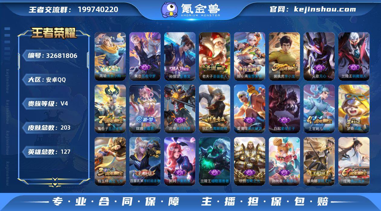 安卓Q-V4-永恒钻石III段位-127英雄-203皮肤-36史诗 【限定皮肤】:白起狰,狄仁杰阴阳师,虞姬凯尔特女王,嬴政优雅恋人,庄周蜃楼王,庄周高山流水,高渐离死亡摇滚,孙膑妖精王,扁鹊炼金王,芈月重明,周瑜赤莲之焰,元歌无心,夏侯惇朔风刀,曹操烛龙,典韦穷奇,狄仁杰万华元夜,达摩沙漠行僧,项羽海滩派对,老夫子圣诞老人,老夫子醍醐杖,程咬金演武夺筹,兰陵王驯魔猎人,兰陵王金庭之子,孙悟空至尊宝,牛魔御旌,李元芳云中旅人,钟馗驱傩正仪,杨玉环遇见飞天,雅典娜黎明之约,太乙真人饕餮,太乙真人华丽摇滚,鬼谷子原初探秘者,鬼谷子五谷丰年,苏烈千军破阵,百里玄策原初追逐者,弈星混沌棋,梦奇顽趣,沈梦溪大漠名商,明世隐疑决卦,裴擒虎李小龙,裴擒虎擒涛扼浪,盾山御銮,上官婉儿梁祝,嫦娥拒霜思,鲁班大师探海日志,桑启海盐诗旅,艾琳女武神,张良古海寻踪,鬼谷子天穹祈灯,姬小满妄想食味 【赛季限定】:庄周蜃楼王,孙膑妖精王,扁鹊炼金王,虞姬凯尔特女王,白起狰,太乙真人饕餮,曹操烛龙,芈月重明,典韦穷奇,牛魔御旌,盾山御銮,夏侯惇朔风刀,弈星混沌棋,明世隐疑决卦,老夫子醍醐杖,鬼谷子原初探秘者,狄仁杰万华元夜,程咬金演武...