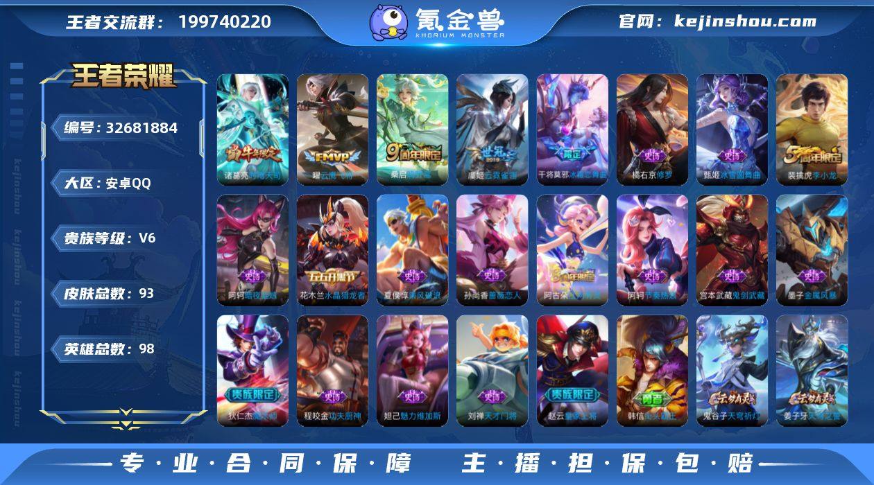 实名: 可修改 性别: 女号 贵族等级: V6 英雄数: 98 皮肤数: 93 传说皮: 云鹰飞将,云霓雀翎 限定皮: 李小龙,时雨天司,冰霜恋舞曲,鸣野蒿 亮点: 【优质装备】:云鹰飞将(小将军),云霓雀翎