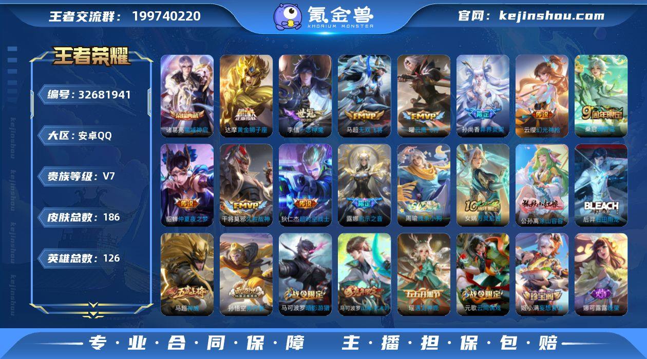 实名: 可修改 性别: 女号 贵族等级: V7 英雄数: 126 皮肤数: 186 荣耀水晶: 星域神启 传说皮: 黄金狮子座,云鹰飞将,久胜战神,一念神魔,仲夏夜之梦,超时空战士-狄仁杰,无双飞将,幻光神枪 限定皮: 李小龙,梁祝,异界灵契-孙尚香,天狼溯光者,神威,逐梦之星,如梦令-后羿,高山流水,孙行者,匿光追影者,启示之音,五谷丰年,山海·玄木吟,鸣野蒿 亮点: 【优质装备】:星域神启(倪克斯贼亮),黄金狮子座,云鹰飞将(小将军),久胜战神,一念神魔,仲夏夜之梦(大飞蛾),超时空战士-狄仁杰,无双飞将,涂山容容