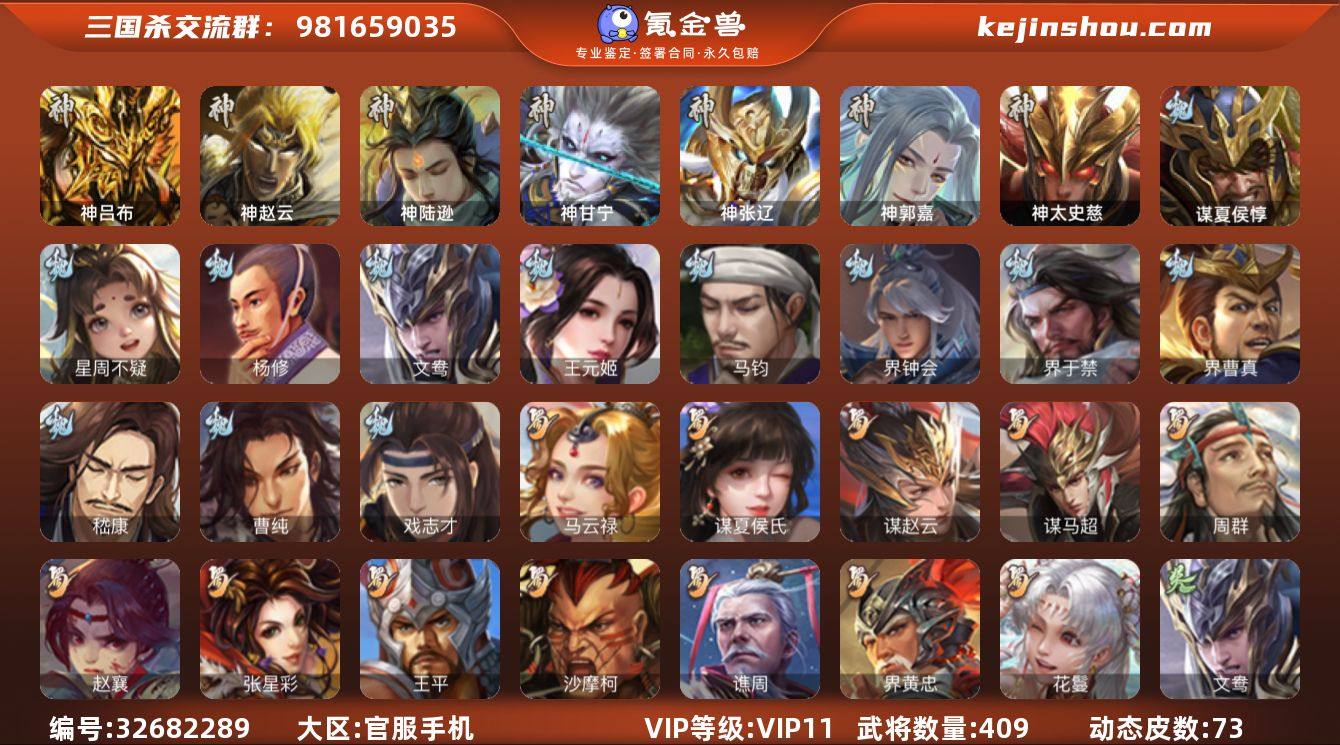 【717】官阶:大将军;VIP等级:VIP11;史诗武将数量:56;动态皮肤数量:73;武将总数:409;史诗宝珠数量:39;将魂数量:4427;神将:10;魏国史诗武将:33;蜀国史诗武将:12;吴国史诗武将:7;群史诗武将:17 神吕布,神赵云,神陆逊,神甘宁,神张辽,神郭嘉,神太史慈,神关羽,神吕蒙,神周瑜,星周不疑,杨修,文鸯,王元姬,马钧,界钟会,界于禁,界曹真,嵇康,曹纯,戏志才,谋夏侯惇,马云騄,谋夏侯氏,谋赵云,谋马超,周群,赵襄,张星彩,王平,沙摩柯,谯周,界黄忠,花鬘,周处,吴景,孙寒华,留赞,界朱然,界徐盛,界步练师,皇甫嵩,左慈,张让,星黄忠,苏飞,麹义,南华老仙,刘焉,沮授,界左慈,界李儒,公孙康,杜预,谋张角,李傕,许攸,星董卓,神郭嘉-虎年清明(动态),神郭嘉-倚星折月(动态),神太史慈-勇撼日月(动态),神甘宁-万人辟易(动态),神陆逊-绽焰摧枯(动态),神吕蒙-兼资文武(动态),神吕布-监兵噬魅(动态),神赵云-战龙在野(动态),星周不疑-才广志宏(动态),曹丕-气荡山河(动态),甄姬-明珠耀躯(动态),曹丕-龙年中秋(动态),SP蔡文姬-兔年冬日(动态),荀彧-驱虎吞狼(动态),曹丕-牛年清明(动态),界曹丕-牛年清明(动态),钟会-谋谟之勋(动态),界曹植-鼠年端午(动态),界钟会-谋谟之勋(动态),戏志才-举棋若定(动态),...