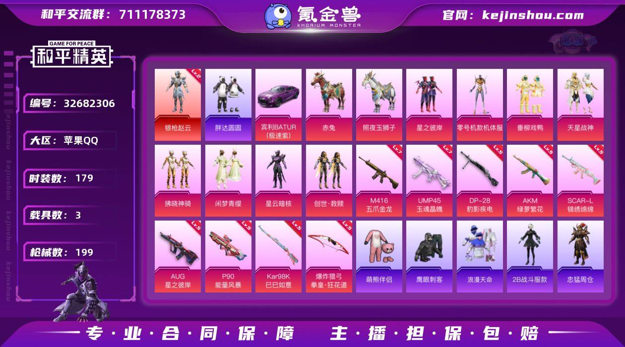苹果 手Q-1神装-8粉装-10特效枪-3载具-2粉色飞行器-72712热力值-17王牌印记-179套装-199枪皮 【红色神装等级】:角色-银枪赵云(二级) 【红色角色神装】:角色-银枪赵云 【热门品类】:套装-浪漫天命,套装-胖达圆圆,角色-2B战斗服款,角色-忠猛周仓,角色-忠真马岱,角色-忠义严颜,套装-龟仙人,套装-萌熊伴侣,大砍刀-青龙偃月刀,撬棍-龙胆亮银枪 【粉色套装】:粉装-星之彼岸,角色-零号机款机体服,粉装-垂柳戏鸭,粉装-天星战神,粉装-拂晓神骑,粉装-闲梦青缨,角色-星云暗核,套装-创世·救赎 【粉色枪皮等级】:AKM-绿萝繁花(五级),SCAR-L-锦绣绵绵(五级),M416-五爪金龙(七级),AUG-星之彼岸(五级),UMP45-玉魂晶魄(七级),P90-能量风暴(五级),Kar98K-巳巳如意(五级),Mk14-福马献瑞(四级),DP-28-豹影疾电(五级),爆炸猎弓-拳皇·狂花道(五级) 【粉色载具】:宾利BATUR(极速紫),赤兔,照夜玉狮子 【粉色枪皮】:AKM-绿萝繁花,SCAR-L-锦绣绵绵,M416-五爪金龙,AUG-星之彼岸,UMP45-玉魂晶魄,P90-能量风暴,Kar98K-巳巳如意,Mk14-福马献瑞,DP-28-豹影疾电,爆炸猎弓-拳皇·狂花道 【粉色飞行器】:炫彩糖果飞行器,星之彼岸飞行器 【粉色降落伞】:梦幻火箭...