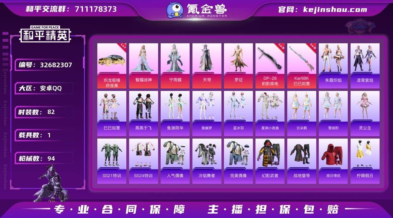 安卓 手Q-4粉装-2特效枪-1载具-1粉色飞行器-28959热力值-1王牌印记-82套装-94枪皮 【红色载具】:炽龙极锋(烬夜黑)(一级) 【粉色套装】:角色-智耀战神,角色-宁雨蝶,角色-天穹,角色-罗征 【粉色枪皮等级】:Kar98K-巳巳如意(五级),DP-28-豹影疾电(五级) 【粉色载具】:炽龙极锋(烬夜黑) 【粉色枪皮】:Kar98K-巳巳如意,DP-28-豹影疾电 【粉色飞行器】:炫彩糖果飞行器 【粉色降落伞】:仲夏莫吉托降落伞,桃粉嫣然降落伞,绯穹魔姬降落伞,无垠阁降落伞,魔童闹海 敖丙降落伞,异瞳寒姬降落伞,炫彩糖果降落伞 【稀有套装】:套装-巳巳如意,套装-炫彩糖果,套装-燕燕于飞,套装-鱼渊荷华,套装-紫幽梦,套装-蓝冰羽,套装-星渊小夜曲,套装-云朵鹅,套装-雪绒豹,角色-灵公主,套装-朱霞炽焰,套装-凌霄紫焰 【稀有枪皮】:AKM-破晓战魂,M16A4-红色方程式,SCAR-L-夜灯,SCAR-L-玉兔迎春,M416-糯团青竹,M416-红色方程式,M416-蓝色火焰,AUG-耀粉歌者,M762-天降萌叽,M762-彩虹符号,M762-云朵鹅,G36C-桃粉嫣然,AC-VAL-天降萌叽,ARX-凌霄紫焰,UZI-天降萌叽,UZI-红色方程式,UMP45-仲夏莫吉托,UMP45-夜灯,UMP45-涂山之恋,Vector-生命誓言,汤姆逊-天降萌...