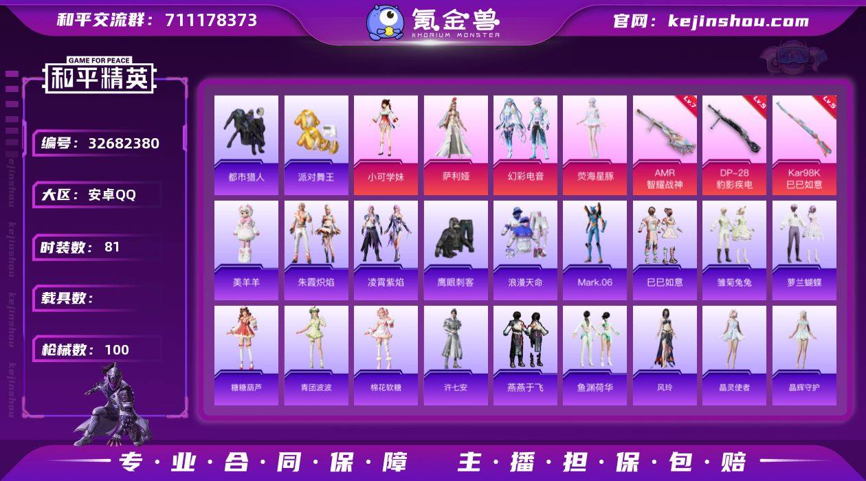 安卓 手Q-4粉装-4特效枪-0载具-2粉色飞行器-34350热力值-7王牌印记-81套装-100枪皮 【热门品类】:套装-浪漫天命,套装-都市猎人,套装-派对舞王,角色-Mark.06 【粉色套装】:角色-小可学妹,角色-萨利娅,粉装-幻彩电音,角色-荧海星豚 【粉色枪皮等级】:Kar98K-巳巳如意(五级),Mk14-福马献瑞(五级),AMR-智耀战神(七级),DP-28-豹影疾电(五级) 【粉色枪皮】:Kar98K-巳巳如意,Mk14-福马献瑞,AMR-智耀战神,DP-28-豹影疾电 【粉色飞行器】:炫彩糖果飞行器,初号机 觉醒Ver.飞行器 【粉色降落伞】:炫光之旅降落伞,莲影清波降落伞,精灵梦叶罗丽降落伞,初号机 觉醒Ver.降落伞,金丰海韵降落伞,晶梦幻蝶降落伞,智耀战神降落伞,星穹咏叹调降落伞,镜花水月降落伞 【稀有套装】:套装-巳巳如意,套装-马上来财,套装-雏菊兔兔,套装-萝兰蝴蝶,套装-糖糖葫芦,套装-青团波波,套装-棉花软糖,角色-许七安,套装-燕燕于飞,套装-鱼渊荷华,角色-风玲,套装-晶灵使者,套装-晶辉守护,套装-风舞幻音,套装-霓虹热舞,套装-彩虹兔,套装-云朵鹅,套装-雪绒豹,套装-蓝海鲸歌,套装-朱霞炽焰,套装-凌霄紫焰,玩偶服-美羊羊,角色-暖阳柴柴 【稀有枪皮】:AKM-影袭,AKM-...