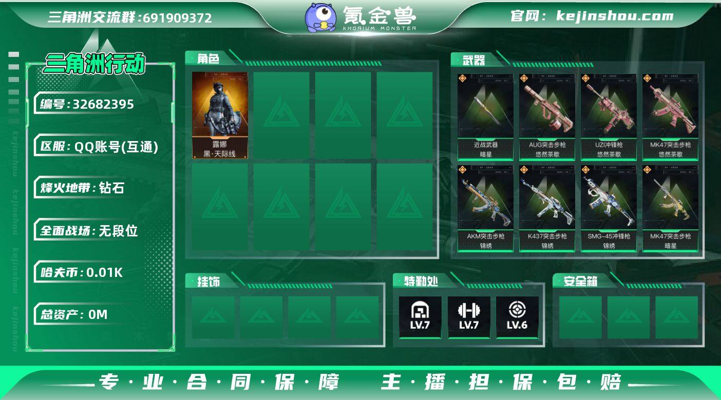 实名: 不可修改 烽火地带段位: 钻石 全面战场段位: 无段位 总资产: 100 哈夫币: 18 干员外观: 露娜-黑·天际线 传说武器皮肤: M4A1突击步枪-蚀金玫瑰,M4A1突击步枪-阿米娅,CAR-15突击步枪-阿米娅,复合弓-黑-天际线,AWM狙击步枪-捞点薯条,腾龙突击步枪-捞点薯条,93R-捞点薯条,AK-12突击步枪-特斯拉线圈,SR-3M紧凑突击步枪-特斯拉线圈,UZI冲锋枪-特斯拉线圈,勇士冲锋枪-能天使-午夜邮差,SCAR-H战斗步枪-启航,近战-暗星,MK47突击步枪-暗星,SR-3M紧凑突击步枪-暗星,SMG-45冲锋枪-锦绣,K437突击步枪-锦绣,AKM突击步枪-锦绣,MK47突击步枪-悠然茶歇,AUG突击步枪-悠然茶歇,UZI冲锋枪-悠然茶歇