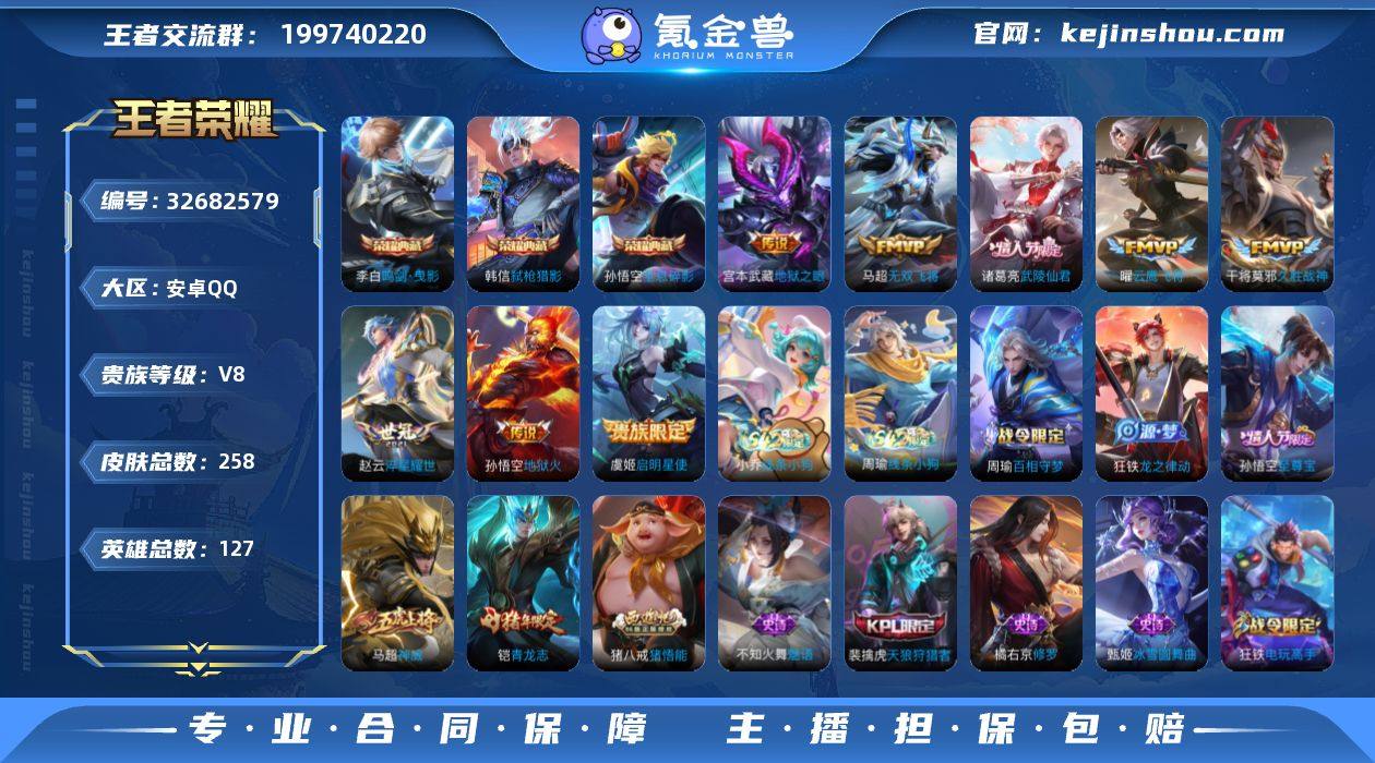 安卓Q-V8-最强王者段位-127英雄-258皮肤-3典藏皮肤-8传说-61史诗 【英雄全皮】:狂铁全皮,影全皮 【荣耀典藏】:孙悟空全息碎影,李白鸣剑曳影,韩信弑枪猎影 【传说皮肤】:马超无双飞将,赵云淬星耀世,虞姬启明星使,曜云鹰飞将,干将莫邪久胜战神,诸葛亮武陵仙君,宫本武藏地狱之眼,孙悟空地狱火 【限定皮肤】:白起狰,姜子牙天穹之誓,狄仁杰阴阳师,虞姬凯尔特女王,赵云皇家上将,墨子神迹守卫,嬴政优雅恋人,孙尚香蔷薇恋人,庄周高山流水,白起夜都怪侠,芈月重明,芈月幻夜卜梦,吕布猎兽之王,元歌无心,夏侯惇朔风刀,曹操烛龙,典韦穷奇,狄仁杰魔术师,狄仁杰万华元夜,达摩星际陆战队,达摩沙漠行僧,项羽海滩派对,老夫子醍醐杖,关羽百相守梦,程咬金演武夺筹,王昭君午后时光,兰陵王金庭之子,花木兰瑞麟志,孙悟空美猴王,孙悟空至尊宝,牛魔御旌,李元芳云中旅人,虞姬启明星使,钟馗驱傩正仪,雅典娜单词大作战,雅典娜黎明之约,太乙真人饕餮,鬼谷子原初探秘者,诸葛亮武陵仙君,黄忠火炮绅士,铠青龙志,苏烈千军破阵,百里玄策原初追逐者,弈星混沌棋,梦奇顽趣,沈梦溪大漠名商,明世隐疑决卦,明世隐吟游魔法,裴擒虎天狼狩猎者,裴擒虎李小...