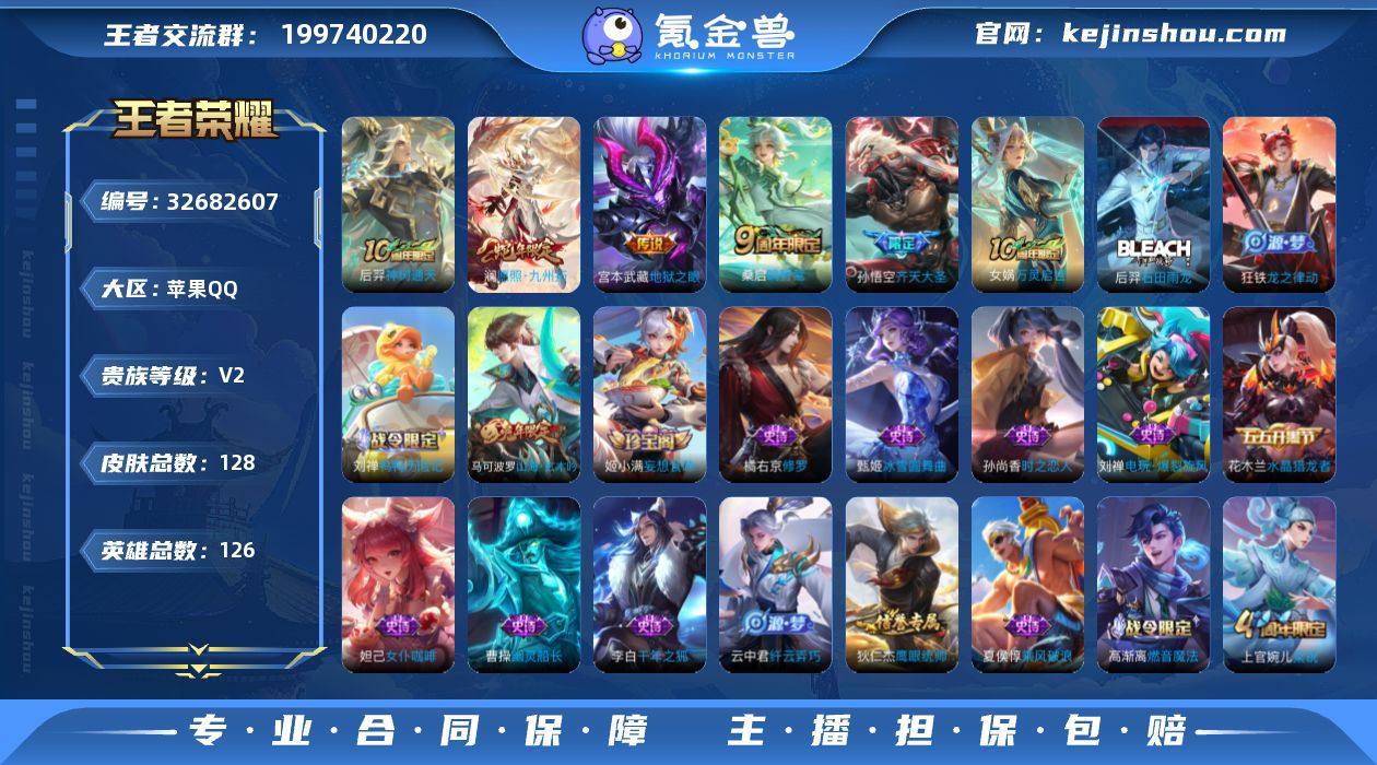 苹果Q-V2-至尊星耀V段位-126英雄-128皮肤-5传说-41史诗 【传说皮肤】:后羿神树通天,澜愿照九州拓,桑启鸣野蒿,孙悟空齐天大圣,宫本武藏地狱之眼 【限定皮肤】:蒙犽顽岩魄,姜子牙天穹之誓,杨戬破阵退雄兵,狄仁杰阴阳师,赵云皇家上将,马可波罗山海玄木吟,狄仁杰魔术师,项羽海滩派对,孙悟空齐天大圣,李元芳云中旅人,裴擒虎擒涛扼浪,云中君纤云弄巧,上官婉儿梁祝,蒙犽狂想玩偶喵,鲁班大师探海日志,桑启海盐诗旅,阿古朵江河有灵,张良古海寻踪,高渐离燃音魔法,妲己灵卜魔法,鬼谷子天穹祈灯,姬小满妄想食味,沈梦溪龙舞盛年,鲁班七号蔬乡物语,李元芳蔬乡物语,刘邦剑破天穹,程咬金群星魔术团,周瑜熔金海岸 【年限皮肤】:马可波罗山海玄木吟,澜愿照九州拓 【赛季限定】:李元芳云中旅人,桑启海盐诗旅,裴擒虎擒涛扼浪,鲁班大师探海日志,张良古海寻踪,鬼谷子天穹祈灯,刘邦剑破天穹,姜子牙天穹之誓,东皇太一噬灭天穹,太乙真人谧流熔炉,钟馗虚灵犬护,甄姬逆浪荇歌 【战令限定】:蒙犽狂想玩偶喵,高渐离燃音魔法,妲己灵卜魔法,鲁班七号蔬乡物语,李元芳蔬乡物语,刘禅鸭鸭历险记,沈梦溪鸭鸭历险记 【史诗皮肤】:女娲万灵启世,后羿石田雨...