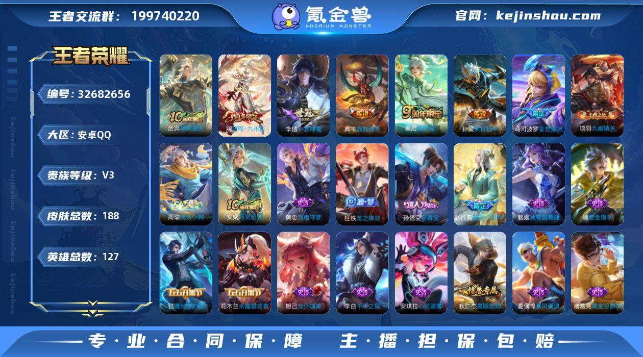 安卓Q-V3-永恒钻石I段位-127英雄-188皮肤-7传说-40史诗 【传说皮肤】:后羿神树通天,澜愿照九州拓,桑启鸣野蒿,典韦战鼓燎原,马可波罗妄想实况,孙策末日机甲,李信一念神魔 【限定皮肤】:白起狰,蔡文姬夏日便利店,虞姬夏日便利店,姜子牙天穹之誓,狄仁杰阴阳师,赵云皇家上将,高渐离玩趣恶龙,芈月重明,夏侯惇朔风刀,曹操烛龙,典韦穷奇,马可波罗妄想实况,狄仁杰魔术师,达摩沙漠行僧,项羽海滩派对,老夫子醍醐杖,兰陵王金庭之子,孙悟空至尊宝,李元芳云中旅人,钟馗驱傩正仪,干将莫邪胡桃夹子,雅典娜黎明之约,太乙真人饕餮,鬼谷子原初探秘者,弈星混沌棋,沈梦溪大漠名商,明世隐疑决卦,裴擒虎擒涛扼浪,狂铁御狮,米莱狄御霄,盾山御銮,上官婉儿梁祝,鲁班大师探海日志,桑启海盐诗旅,张良古海寻踪,鬼谷子天穹祈灯,沈梦溪龙舞盛年,鲁班七号蔬乡物语,李元芳蔬乡物语,刘邦剑破天穹,程咬金群星魔术团 【年限皮肤】:澜愿照九州拓 【赛季限定】:白起狰,太乙真人饕餮,曹操烛龙,芈月重明,典韦穷奇,狂铁御狮,米莱狄御霄,盾山御銮,夏侯惇朔风刀,弈星混沌棋,明世隐疑决卦,老夫子醍醐杖,鬼谷子原初探秘者,钟馗驱傩正仪,达摩沙漠行僧,兰...