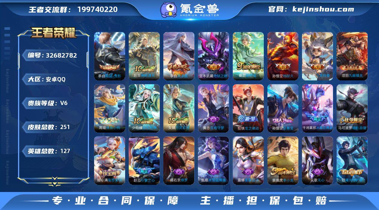 安卓Q-V6-最强王者段位-127英雄-251皮肤-1典藏皮肤-6传说-59史诗 【荣耀典藏】:李白鸣剑曳影 【传说皮肤】:后羿神树通天,桑启鸣野蒿,李元芳飞鸢探春,李白凤求凰,宫本武藏地狱之眼,孙悟空地狱火 【限定皮肤】:白起狰,蒙犽顽岩魄,姜子牙天穹之誓,杨戬破阵退雄兵,狄仁杰阴阳师,虞姬凯尔特女王,赵云皇家上将,赵云引擎之心,庄周高山流水,高渐离死亡摇滚,孙膑妖精王,扁鹊炼金王,芈月重明,元歌无心,夏侯惇朔风刀,曹操烛龙,典韦穷奇,马可波罗暗影游猎,狄仁杰魔术师,狄仁杰万华元夜,项羽海滩派对,老夫子醍醐杖,程咬金演武夺筹,韩信逐梦之影,兰陵王金庭之子,花木兰瑞麟志,孙悟空至尊宝,牛魔御旌,李元芳云中旅人,钟馗驱傩正仪,干将莫邪冰霜恋舞曲,太乙真人饕餮,鬼谷子原初探秘者,苏烈千军破阵,百里玄策原初追逐者,弈星混沌棋,沈梦溪大漠名商,明世隐疑决卦,裴擒虎李小龙,狂铁御狮,米莱狄御霄,盾山御銮,桑启海盐诗旅,阿古朵江河有灵,张良古海寻踪,鬼谷子天穹祈灯,姬小满妄想食味,沈梦溪龙舞盛年,刘邦剑破天穹,程咬金群星魔术团,周瑜熔金海岸 【年限皮肤】:李白凤求凰,花木兰瑞麟志 【赛季限定】:孙膑妖精王,扁鹊炼金王,虞...