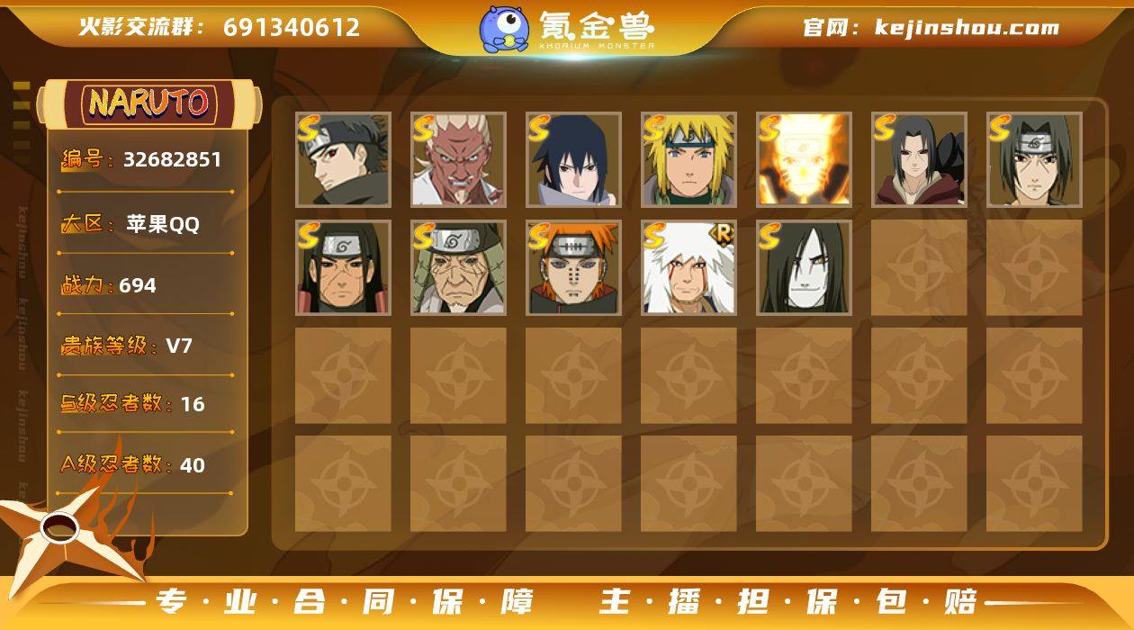 V7 16S忍 40A忍 15通灵 694.7W战力 可二次 可修改实名 【S级忍者】宇智波止水「须佐能乎」,艾「忍界大战」,宇智波佐助「永恒万花筒」,漩涡鸣人 「九喇嘛连结」,千手柱间「秽土转生」,自来也 「舞之豪杰」,旗木卡卡西「须佐能乎」,自来也 「传说中的三忍」,波风水门「九喇嘛连结」,漩涡鸣人·宇智波佐助,宇智波鼬「秽土转生」,猿飞日斩「秽土转生」,宇智波鼬 「须佐能乎」,佩恩「天道」,波风水门,大蛇丸
