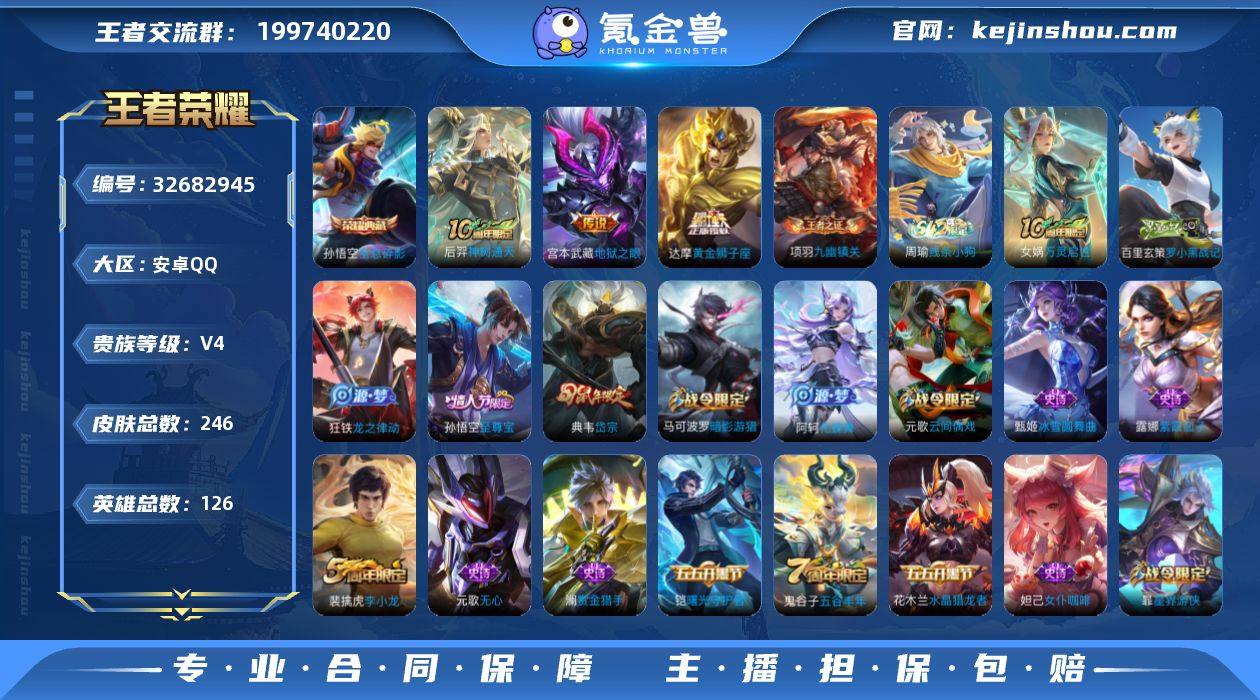 安卓Q-V4-最强王者段位-126英雄-246皮肤-1典藏皮肤-3传说-56史诗 【荣耀典藏】:孙悟空全息碎影 【传说皮肤】:后羿神树通天,达摩黄金狮子座,宫本武藏地狱之眼 【限定皮肤】:狄仁杰阴阳师,赵云皇家上将,墨子神迹守卫,庄周高山流水,元歌云间偶戏,元歌无心,夏侯惇朔风刀,甄姬游园惊梦,典韦穷奇,典韦岱宗,马可波罗暗影游猎,狄仁杰魔术师,狄仁杰万华元夜,达摩星际陆战队,达摩沙漠行僧,项羽海滩派对,老夫子醍醐杖,老夫子航海奇遇记,程咬金演武夺筹,兰陵王金庭之子,亚瑟潮玩骑士王,孙悟空至尊宝,牛魔御旌,李元芳云中旅人,钟馗驱傩正仪,杨玉环遇见飞天,干将莫邪胡桃夹子,雅典娜黎明之约,鬼谷子原初探秘者,鬼谷子五谷丰年,苏烈千军破阵,百里玄策原初追逐者,弈星混沌棋,梦奇顽趣,沈梦溪大漠名商,明世隐疑决卦,裴擒虎李小龙,裴擒虎擒涛扼浪,狂铁御狮,米莱狄御霄,米莱狄胡桃异想国,盾山御銮,上官婉儿梁祝,嫦娥暖冬兔眠,鲁班大师探海日志,桑启海盐诗旅,暃星界游侠,艾琳女武神,阿古朵江河有灵,张良古海寻踪,蒙恬荣光圣徽,鬼谷子天穹祈灯,沈梦溪龙舞盛年,刘邦剑破天穹,程咬金群星魔术团 【年限皮肤】:典韦岱宗 【赛季限定】:典...
