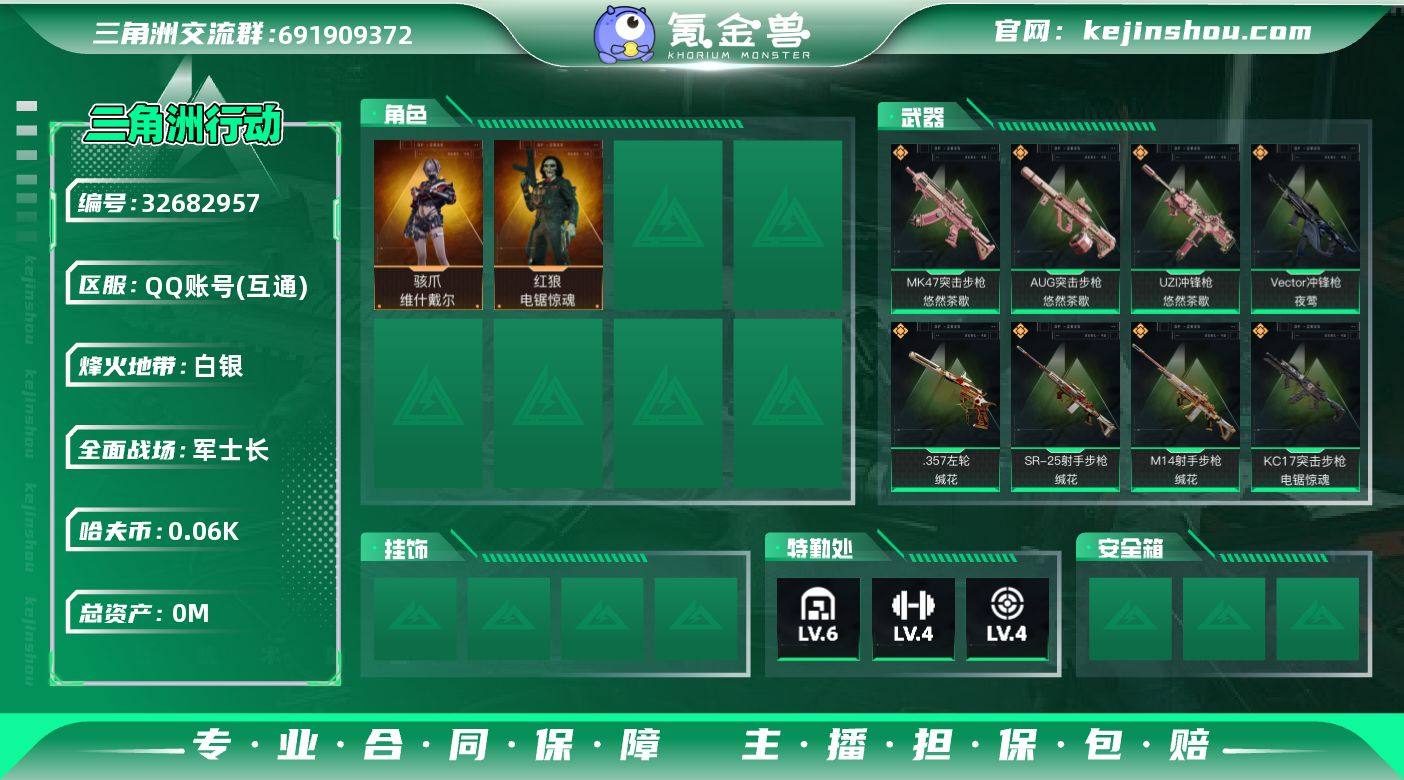 实名: 可修改 烽火地带段位: 白银 全面战场段位: 军士长 总资产: 153 哈夫币: 69 干员外观: 骇爪-维什戴尔,红狼-电锯惊魂 传说武器皮肤: M4A1突击步枪-阿米娅,R93狙击步枪-维什戴尔,SCAR-H战斗步枪-启航,ASh-12战斗步枪-鹅鸭杀,QCQ171冲锋枪-鹅鸭杀,QJB201轻机枪-鹅鸭杀,G3战斗步枪-骑士,KC17突击步枪-电锯惊魂,Vector冲锋枪-夜莺,.357左轮-缄花,SR-25射手步枪-缄花,M14射手步枪-缄花,MK47突击步枪-悠然茶歇,AUG突击步枪-悠然茶歇,UZI冲锋枪-悠然茶歇