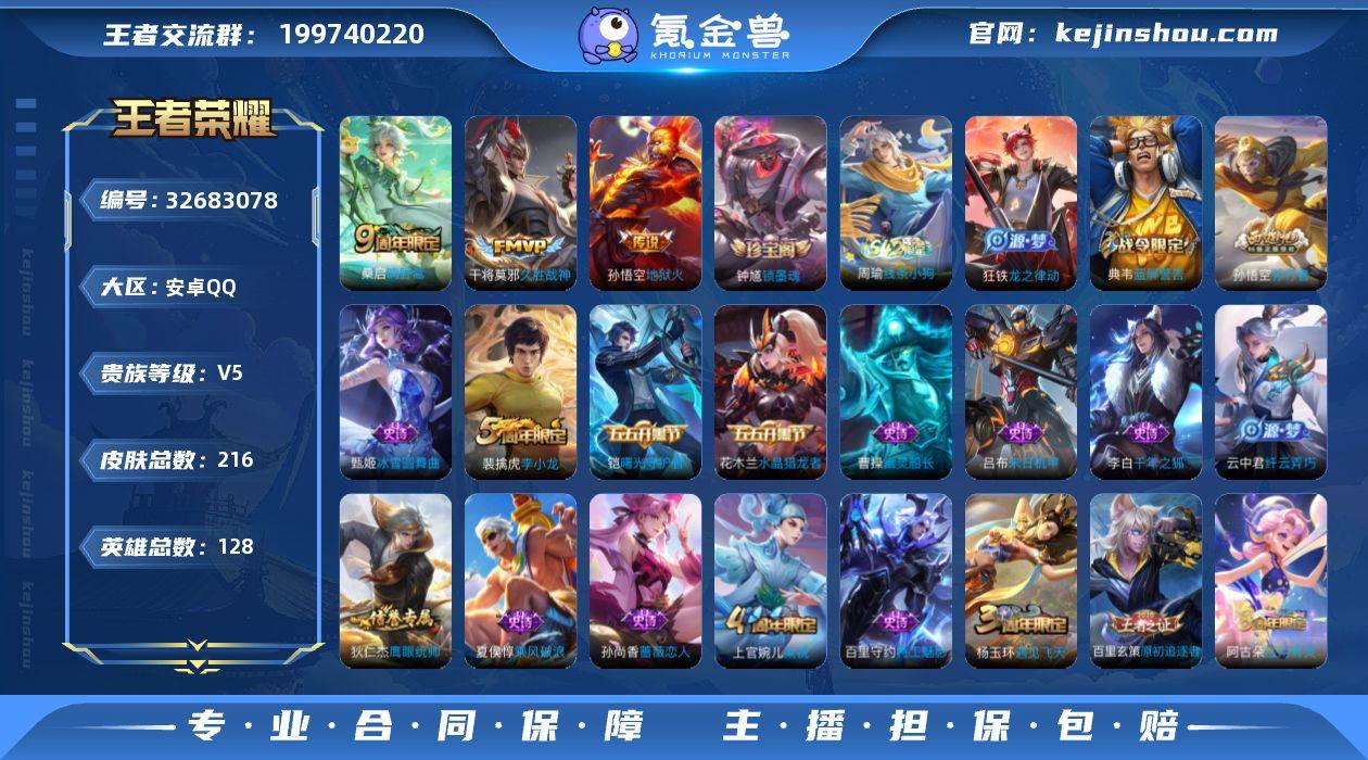 安卓Q-V5-最强王者段位-128英雄-216皮肤-3传说-41史诗 【传说皮肤】:桑启鸣野蒿,干将莫邪久胜战神,孙悟空地狱火 【限定皮肤】:白起狰,姜子牙天穹之誓,狄仁杰阴阳师,赵云皇家上将,嬴政优雅恋人,孙尚香蔷薇恋人,庄周高山流水,芈月重明,夏侯惇朔风刀,甄姬游园惊梦,曹操烛龙,典韦穷奇,典韦蓝屏警告,狄仁杰万华元夜,达摩沙漠行僧,项羽海滩派对,老夫子醍醐杖,程咬金演武夺筹,兰陵王金庭之子,孙悟空孙行者,牛魔御旌,李元芳云中旅人,钟馗驱傩正仪,杨玉环遇见飞天,女娲朔望之晖,蔡文姬繁星吟游,鬼谷子原初探秘者,苏烈千军破阵,百里玄策原初追逐者,弈星混沌棋,沈梦溪大漠名商,明世隐疑决卦,裴擒虎李小龙,裴擒虎擒涛扼浪,狂铁御狮,米莱狄御霄,云中君纤云弄巧,盾山御銮,上官婉儿梁祝,鲁班大师探海日志,阿古朵江河有灵,张良古海寻踪,鬼谷子天穹祈灯,刘邦剑破天穹,程咬金群星魔术团,镜青焰无极,项羽苍威无极,周瑜熔金海岸 【赛季限定】:白起狰,曹操烛龙,芈月重明,典韦穷奇,狂铁御狮,米莱狄御霄,牛魔御旌,盾山御銮,夏侯惇朔风刀,弈星混沌棋,明世隐疑决卦,老夫子醍醐杖,鬼谷子原初探秘者,狄仁杰万华元夜,程咬金演武夺筹,...