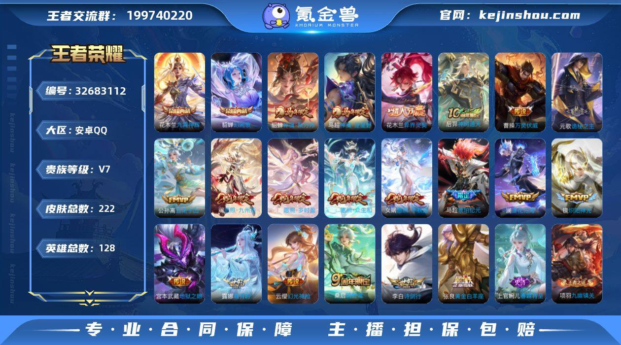 安卓Q-V7-至尊星耀IV段位-128英雄-222皮肤-2典藏皮肤-20传说-54史诗 【英雄全皮】:孙权全皮,敖隐全皮 【荣耀典藏】:花木兰九霄神辉,貂蝉幻阙歌 【传说皮肤】:貂蝉神骥聚万邦,马超神骥逐星野,花木兰异界灵契,后羿神树通天,曹操万灵伏威,元歌诡秘之主,公孙离云诺千山,女娲愿照千秋盛,妲己愿照众生和,澜愿照九州拓,虞姬愿照岁时盈,云缨幻光神枪,桑启鸣野蒿,马超琥珀纪元,澜逐花归海,露娜霜月吟,李白诗剑行,镜炽阳神光,张良黄金白羊座,宫本武藏地狱之眼 【限定皮肤】:蒙犽顽岩魄,姜子牙天穹之誓,杨戬破阵退雄兵,狄仁杰阴阳师,赵云皇家上将,元歌无心,马可波罗山海玄木吟,狄仁杰魔术师,项羽海滩派对,孙悟空孙行者,李元芳匿光侦查者,李元芳云中旅人,钟馗驱傩正仪,干将莫邪胡桃夹子,百里玄策原初追逐者,裴擒虎李小龙,裴擒虎擒涛扼浪,云中君纤云弄巧,嫦娥拒霜思,嫦娥暖冬兔眠,鲁班大师探海日志,桑启海盐诗旅,暃星界游侠,艾琳女武神,张良古海寻踪,蒙犽百解令,鬼谷子天穹祈灯,马超琥珀纪元,沈梦溪龙舞盛年,刘邦剑破天穹,上官婉儿群星魔术团,程咬金群星魔术团,周瑜熔金海岸 【年限皮肤】:马可波罗山海玄木吟,女娲愿照千秋盛,...
