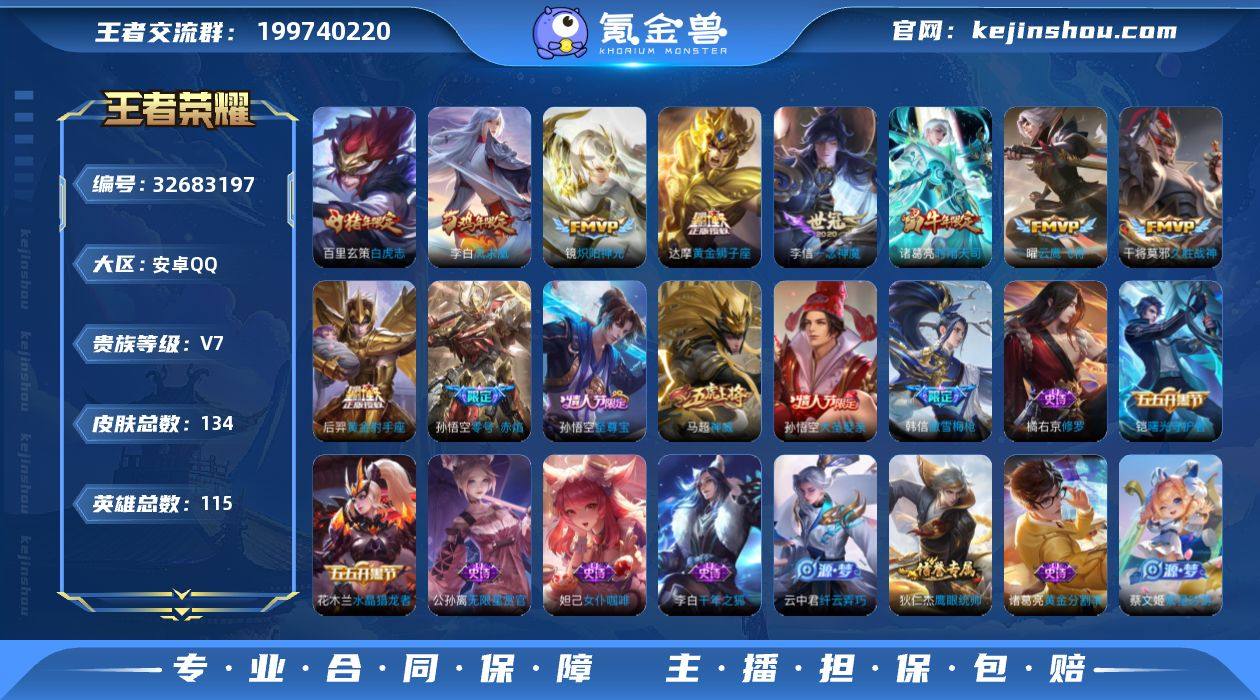 5英雄 134皮肤 可修改实名 男号 【英雄全皮】孙权全皮 【稀有英雄】嬴政(始皇帝),韩信(韩跳跳),夏洛特(夏师傅),艾琳,橘右京(橘子),娜可露露(鸟人),不知火舞,赵云,金蝉(唐僧),戈娅 【传说皮】黄金狮子座,黄金射手座,零号·赤焰,末日机甲-孙尚香(绿蚂蚱),一念神魔,久胜战神,云鹰飞将(小将军),炽阳神光 【珍宝阁皮】女武神 【赛季/战令皮】饕餮(s9),御銮(s16),朔风刀(s17),混沌棋(s18),疑决卦(s19),醍醐杖(s20),原初探秘者(s21),万华元夜(s22),演武夺筹(s23),驱傩正仪(s24),千军破阵(s25),猎兽之王,白昼王子,蓝屏警告,神迹守卫-钟馗,狮舞东方,星空之诺,银河之约,夺宝奇兵,迷踪丽影,西部大镖客-猪八戒,暗影游猎(游乐娃子),单词大作战,狂想玩偶喵,沙漠行僧(s26) 【史诗皮】白龙吟,黄金分割率,千年之狐,无限星赏官,冰冠公主,修罗,女仆咖啡,纤云弄巧,繁星吟游(呼啦呼啦),水晶猎龙者,曙光守护者,箭羽风息,圣诞恋歌,鹰眼统帅,魅力维加斯 【限定皮】至尊宝,白虎志(电光耗子),凤求凰(白切鸡),傲雪梅枪,时雨天司(水龙头),神威(电光马子),飞衡(韩信年限),梁祝,天狼狩猎者,李小龙,逐梦之影,朱雀志(守约年限),大圣娶亲 【普通皮】街头霸王,径山谋武,威尼斯狂欢,万事如意,龙腾万里,花好人间,归...