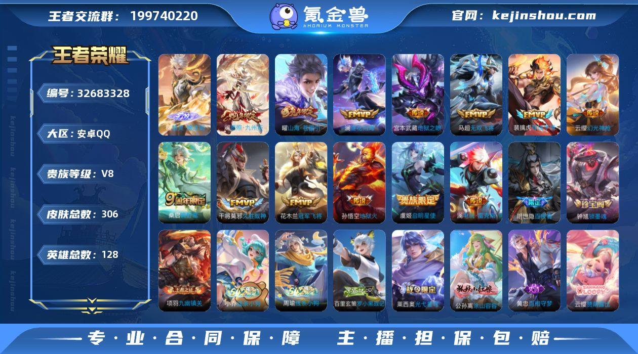 安卓Q-V8-最强王者段位-128英雄-306皮肤-1无双-13传说-97史诗 【英雄全皮】:孙权全皮,鬼谷子全皮,敖隐全皮,澜全皮,空空儿全皮 【无双皮肤】:曜器灵螭龙剑 【传说皮肤】:澜愿照九州拓,云缨幻光神枪,裴擒虎祥瑞亨通,桑启鸣野蒿,澜逐花归海,澜电玩雷克斯,曜山海苍雷引,马超无双飞将,虞姬启明星使,干将莫邪久胜战神,花木兰冠军飞将,宫本武藏地狱之眼,孙悟空地狱火 【限定皮肤】:蒙犽顽岩魄,蔡文姬夏日便利店,大乔绒语心约,虞姬夏日便利店,姜子牙天穹之誓,杨戬破阵退雄兵,狄仁杰阴阳师,赵云皇家上将,赵云引擎之心,孙尚香蔷薇恋人,庄周玄嵩,高渐离死亡摇滚,阿轲迷踪丽影,钟无艳超时空战士,扁鹊奇幻香踪,白起夜都怪侠,元歌云间偶戏,元歌无心,甄姬落雪兰心,马可波罗暗影游猎,马可波罗山海玄木吟,狄仁杰魔术师,狄仁杰万华元夜,达摩沙漠行僧,项羽海滩派对,兰陵王金庭之子,亚瑟潮玩骑士王,孙悟空孙行者,李元芳云中旅人,虞姬启明星使,钟馗驱傩正仪,杨戬潮玩骑兵,雅典娜单词大作战,雅典娜黎明之约,太乙真人华丽摇滚,鬼谷子原初探秘者,鬼谷子五谷丰年,苏烈千军破阵,百里玄策原初追逐者,梦奇顽趣,沈梦溪大漠名商,明世隐吟游魔...
