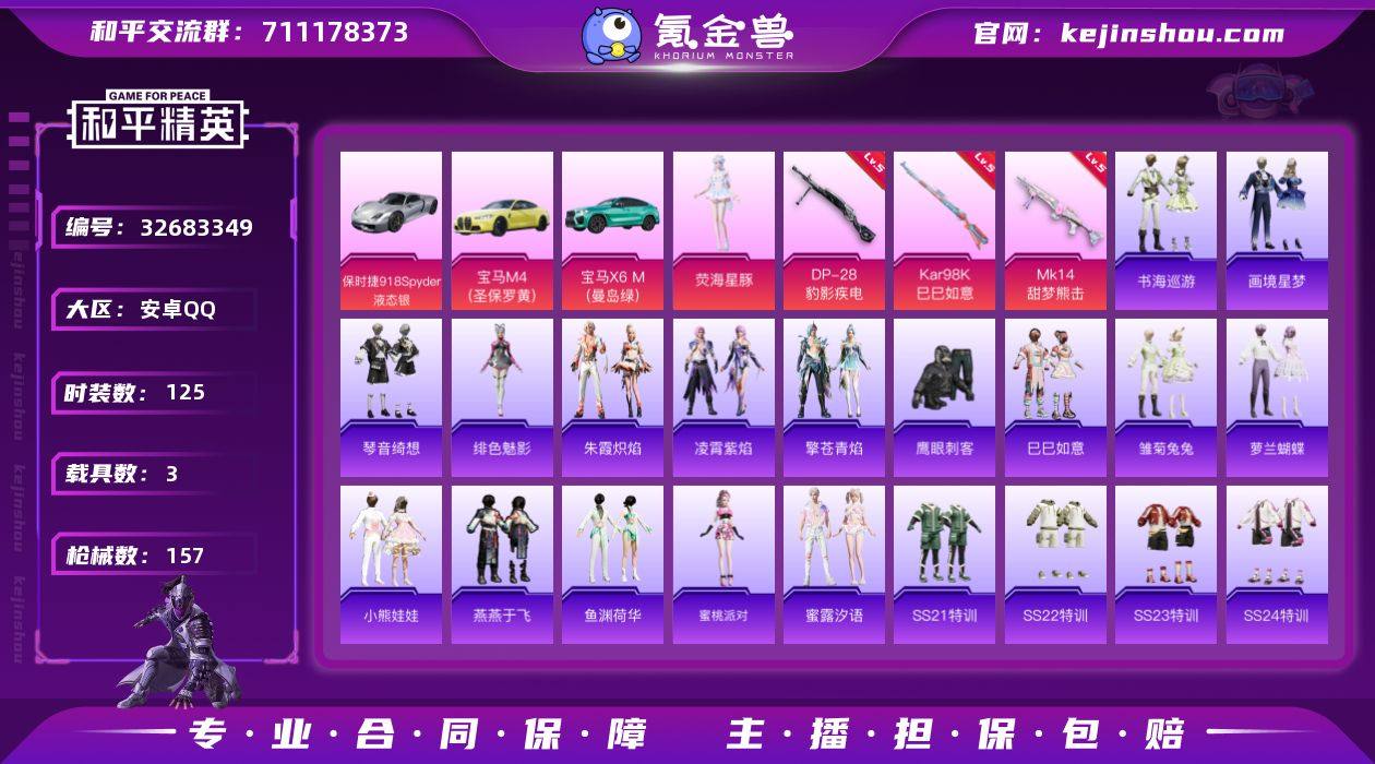 安卓 手Q-2粉装-5特效枪-3载具-1粉色飞行器-45090热力值-7王牌印记-125套装-157枪皮 【粉色套装】:角色-荧海星豚,角色-虎痴许褚 【粉色枪皮等级】:ACE32-萌骑漫游(五级),Kar98K-巳巳如意(五级),Mk14-甜梦熊击(五级),Mk14-福马献瑞(五级),DP-28-豹影疾电(五级) 【粉色载具】:宝马M4(圣保罗黄),宝马X6 M(曼岛绿),保时捷918 Spyder(液态银) 【粉色枪皮】:ACE32-萌骑漫游,Kar98K-巳巳如意,Mk14-甜梦熊击,Mk14-福马献瑞,DP-28-豹影疾电 【粉色飞行器】:炫彩糖果飞行器 【粉色降落伞】:绝对恒星降落伞,暗夜鎏金降落伞,天星战神降落伞,沙丘之主降落伞,赛博古神降落伞,炫彩糖果降落伞,虎痴许褚降落伞 【稀有套装】:套装-巳巳如意,套装-雪国风尚,套装-炫彩糖果,套装-马上有钱,套装-迅捷龙虾,套装-雏菊兔兔,套装-萝兰蝴蝶,套装-小熊娃娃,套装-燕燕于飞,套装-鱼渊荷华,角色-蜜桃派对,套装-蜜露汐语,套装-朱霞炽焰,套装-凌霄紫焰,套装-擎苍青焰,角色-绯色魅影,套装-书海巡游,套装-画境星梦,套装-琴音绮想,套装-雨过天青,套装-红釉青花 【稀有枪皮】:AUG-冰晶雪宝,AKM-彩虹符号,AKM-破晓战魂,AKM-缤纷海域,AKM-龙的传人,M16A4-千...