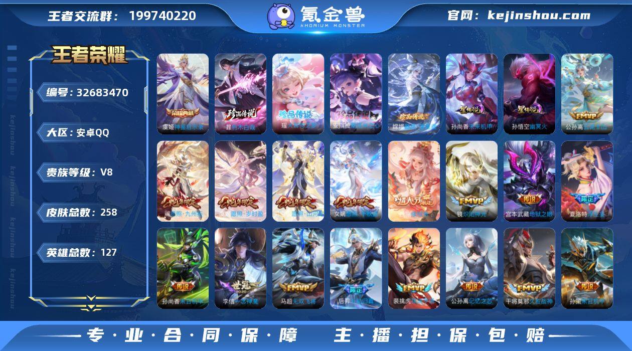 安卓Q-V7-至尊星耀II段位-127英雄-258皮肤-1典藏皮肤-4珍品传说-26传说-72史诗 【英雄全皮】:孙权全皮,空空儿全皮 【荣耀典藏】:虞姬神鉴启示录 【珍品传说】:暃朽木白哉,安琪拉酷洛米之心,瑶大耳狗之梦,嫦娥器灵落星盏 【传说皮肤】:公孙离云诺千山,西施续相思,后羿千劫归真,司空震愿照山河定,女娲愿照千秋盛,澜愿照九州拓,虞姬愿照岁时盈,裴擒虎祥瑞亨通,上官婉儿妄想奇谈,公孙离记忆之芯,夏洛特浮生妄,吕布怒海麟威,马超无双飞将,孙策末日机甲,赵云淬星耀世,王昭君乞巧织情,铠绛天战甲,镜炽阳神光,虞姬启明星使,李信一念神魔,张良黄金白羊座,干将莫邪久胜战神,梦奇胖达荣荣,后羿黄金射手座,孙尚香末日机甲,宫本武藏地狱之眼 【限定皮肤】:虞姬夏日便利店,狄仁杰阴阳师,赵云皇家上将,赵云引擎之心,阿轲迷踪丽影,芈月重明,夏侯惇朔风刀,曹操烛龙,典韦穷奇,狄仁杰魔术师,狄仁杰万华元夜,达摩沙漠行僧,项羽海滩派对,老夫子醍醐杖,貂蝉逐梦之音,程咬金演武夺筹,刘邦夺宝奇兵,虞姬启明星使,钟馗驱傩正仪,蔡文姬繁星吟游,鬼谷子原初探秘者,鬼谷子五谷丰年,苏烈千军破阵,百里玄策原初追逐者,弈星混沌棋,公孙离蜜橘之夏...
