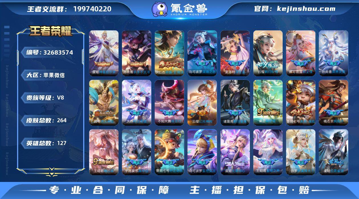 苹果WX-V8-最强王者段位-127英雄-264皮肤-2典藏皮肤-24传说-80史诗 【英雄全皮】:孙权全皮,娜可露露全皮,敖隐全皮,夏洛特全皮,影全皮,姬小满全皮 【荣耀典藏】:孙尚香杀手不太冷,虞姬神鉴启示录 【传说皮肤】:狄仁杰神骥赴朔漠,云缨幻光神枪,王昭君映山客,桑启鸣野蒿,大乔时之奇旅,鲁班七号时之奇旅,吕布遇见神鼓,云缨鹤归松栖,马可波罗妄想实况,诸葛亮鹤羽星尊,夏洛特浮生妄,干将莫邪画中仙,虞姬无限倾心,伽罗炽翼辉光,不知火舞绯月行,王昭君星穹之声,橘右京枫霜尽,娜可露露前尘镜,孙尚香音你闪耀,马可波罗深海之息,鲁班七号寅虎瑞焰,孙尚香异界灵契,虞姬启明星使,虞姬云霓雀翎 【限定皮肤】:狄仁杰阴阳师,赵云皇家上将,墨子神迹守卫,妲己热情桑巴,妲己时之彼端,孙尚香异界灵契,鲁班七号乒乒小将,鲁班七号寅虎瑞焰,鲁班七号时之奇旅,阿轲迷踪丽影,钟无艳王者之锤,钟无艳超时空战士,孙膑寅虎展翼,芈月幻夜卜梦,吕布遇见神鼓,元歌云间偶戏,元歌无心,甄姬游园惊梦,甄姬落雪兰心,马可波罗深海之息,马可波罗妄想实况,狄仁杰魔术师,狄仁杰万华元夜,达摩沙漠行僧,项羽海滩派对,老夫子醍醐杖,貂蝉逐梦之音,程咬金演武夺...
