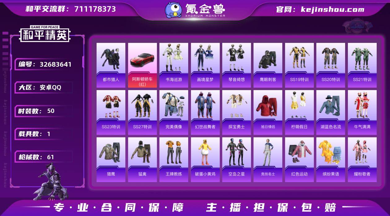 安卓 手Q-1粉装-3特效枪-1载具-0粉色飞行器-17794热力值-2王牌印记-50套装-61枪皮 【热门品类】:套装-都市猎人 【粉色套装】:角色-虎痴许褚 【粉色枪皮等级】:UMP45-萌骑冒险(三级),AKS-74U-森灵之息(五级),Mk14-福马献瑞(五级) 【粉色载具】:阿斯顿马丁DBS(红) 【粉色枪皮】:UMP45-萌骑冒险,AKS-74U-森灵之息,Mk14-福马献瑞 【粉色降落伞】:幻影战神降落伞,四圣焕新降落伞 【稀有套装】:套装-雪国风尚,套装-马上有钱,套装-暮夜私语,套装-书海巡游,套装-画境星梦,套装-琴音绮想,套装-雨过天青,套装-红釉青花 【稀有枪皮】:AKM-影袭,AKM-破晓战魂,M16A4-幻世战舞者,M16A4-甜心亚梦,SCAR-L-玉兔迎春,M416-红色方程式,M416-蓝色火焰,GROZA-影袭,AUG-天降萌叽,AUG-幻影战神,AUG-耀粉歌者,QBZ-彩虹符号,M762-牛气冲天,AC-VAL-甜心亚梦,ACE32-画境星梦,UMP45-蓝色火焰,汤姆逊-幻影战神,汤姆逊-像素花束,MP5K-画境星梦,Kar98K-红色方程式,M24-炫彩节奏,SKS-炫彩节奏,VSS-星之彼岸,VSS-虎痴许褚,M1加兰德-画境星梦,S686-奇异狩猎者,S12K-破晓战魂,DBS-甜心亚梦,AA12-G-画境星梦,DP-28-彩虹符号,DP-28-甜心亚梦,MG3-幻世战舞者,...