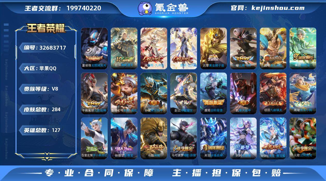 苹果Q-V8-最强王者段位-127英雄-282皮肤-1典藏皮肤-13传说-84史诗 【荣耀典藏】:夏侯惇无限飓风号 【传说皮肤】:后羿神树通天,司空震愿照山河定,澜愿照九州拓,桑启鸣野蒿,吕布遇见神鼓,孙策末日机甲,鲁班七号寅虎瑞焰,赵云淬星耀世,铠绛天战甲,虞姬启明星使,曜云鹰飞将,干将莫邪久胜战神,达摩黄金狮子座 【限定皮肤】:姜子牙天穹之誓,狄仁杰阴阳师,廉颇寅虎御盾,赵云皇家上将,墨子神迹守卫,嬴政优雅恋人,孙尚香蔷薇恋人,鲁班七号寅虎瑞焰,庄周云端筑梦师,庄周高山流水,高渐离玩趣恶龙,阿轲迷踪丽影,钟无艳超时空战士,白起夜都怪侠,芈月幻夜卜梦,吕布御风骁将,吕布遇见神鼓,元歌云间偶戏,元歌无心,夏侯惇朔风刀,甄姬游园惊梦,甄姬落雪兰心,马可波罗暗影游猎,狄仁杰魔术师,狄仁杰万华元夜,达摩星际陆战队,达摩沙漠行僧,项羽海滩派对,项羽霸王别姬,老夫子醍醐杖,老夫子航海奇遇记,关羽冰锋战神,程咬金演武夺筹,刘邦夺宝奇兵,王昭君午后时光,兰陵王金庭之子,亚瑟潮玩骑士王,孙悟空至尊宝,后羿圣弓游侠,李元芳云中旅人,虞姬启明星使,钟馗驱傩正仪,杨玉环遇见飞天,干将莫邪真爱魔法,雅典娜单词大作战,雅典娜黎明之约,...