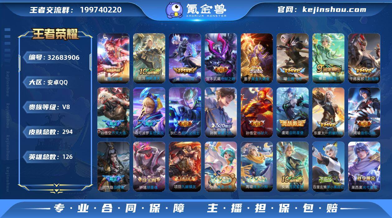 安卓Q-V8-最强王者段位-126英雄-294皮肤-1典藏皮肤-15传说-90史诗 【英雄全皮】:刘禅全皮,孙权全皮,明世隐全皮,金蝉全皮,戈娅全皮 【荣耀典藏】:瑶拾光映像 【传说皮肤】:后羿神树通天,桑启鸣野蒿,墨子黄金天蝎座,澜逐花归海,马可波罗妄想实况,东皇太一灼幽烈阳,孙悟空齐天大圣,孙策挚爱之约,周瑜音你心动,虞姬启明星使,曜云鹰飞将,干将莫邪久胜战神,宫本武藏地狱之眼,孙悟空地狱火,狄仁杰超时空战士 【限定皮肤】:蒙犽顽岩魄,姜子牙天穹之誓,狄仁杰阴阳师,赵云皇家上将,赵云引擎之心,赵云百木心枪,墨子降魔,孙尚香蔷薇恋人,庄周玄嵩,庄周高山流水,高渐离玩趣恶龙,钟无艳超时空战士,孙膑天狼运算者,扁鹊奇幻香踪,白起夜都怪侠,元歌云间偶戏,甄姬落雪兰心,马可波罗暗影游猎,马可波罗山海玄木吟,马可波罗妄想实况,狄仁杰魔术师,狄仁杰万华元夜,达摩沙漠行僧,项羽海滩派对,程咬金演武夺筹,兰陵王金庭之子,孙悟空齐天大圣,李元芳云中旅人,虞姬启明星使,钟馗驱傩正仪,杨戬潮玩骑兵,鬼谷子原初探秘者,鬼谷子五谷丰年,苏烈千军破阵,百里玄策原初追逐者,弈星混沌棋,沈梦溪大漠名商,明世隐疑决卦,明世隐吟游魔法,裴擒虎...