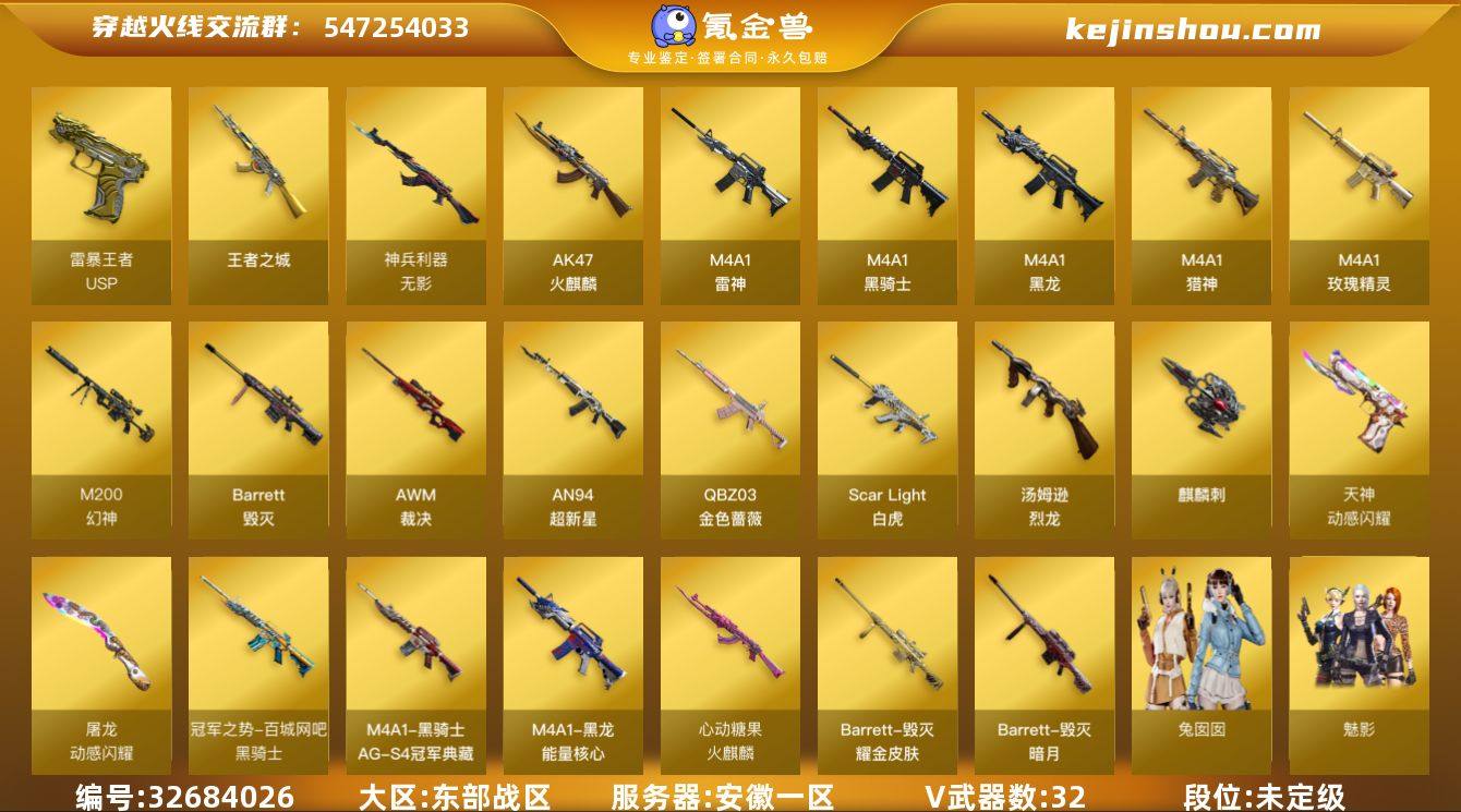 安徽一区-35V-14王者-0炫金 【热门武器】:QBZ03-金色蔷薇,Scar Light-白虎,M200-幻神,金色小号,Cat-刀锋,M4A1-黑骑士,汤姆逊-烈龙*6,斯泰尔-蝴蝶,Knife-冠军之刃,金刚伞 【王者炫金武器】:王者之城,USP-雷暴王者*2 【音效卡】:M4A1-黑骑士音效卡,Scar Light-白虎音效卡,炼狱-百战金芒-庆典舞曲音效卡,沙鹰-修罗-盛典舞曲音效卡,柯尔特-百战金芒-庆典舞曲音效卡 【皮肤】:幻神-冠军之幻,QBZ03-巅峰荣耀皮肤,金色蔷薇-电竞之星 皮肤,裁决-叶芒苍灵 皮肤,M4A1-雷神-巅峰荣耀皮肤,M4A1-再燃火线,雷神-神秘按键 皮肤,火麒麟-心动糖果,毁灭-暗月,毁灭耀金皮肤,毁灭-英雄计划 皮肤,黑龙-能量核心,黑骑士-冠军之势,黑骑士-AG-S4冠军典藏,轻型军用手斧-再燃火线 【角色】:魅影,乔伊教练,暗夜-X,北极狐-X,初恋灵狐,芳心审判者,风暴女,虎妞,嘉年华灵狐,娟娟,兰妹妹,灵狐者-X,灵狐者-七夕宝贝,灵狐者-职业经理,龙儿,龙儿-小淘气,曼陀罗-礼服,潘多拉-X,潘多拉-甜心教官,邱刚敖,斯沃特-X,蜀雪,兔囡囡,雪莉杨-摸金校尉,夜玫瑰-幻能朋克 【人偶武器】:天龙-曼陀罗,斯泰尔-蝴蝶,AWM-灵狐-15周年嘉年华*2,Cat-刀锋,迷你深渊冰龙...