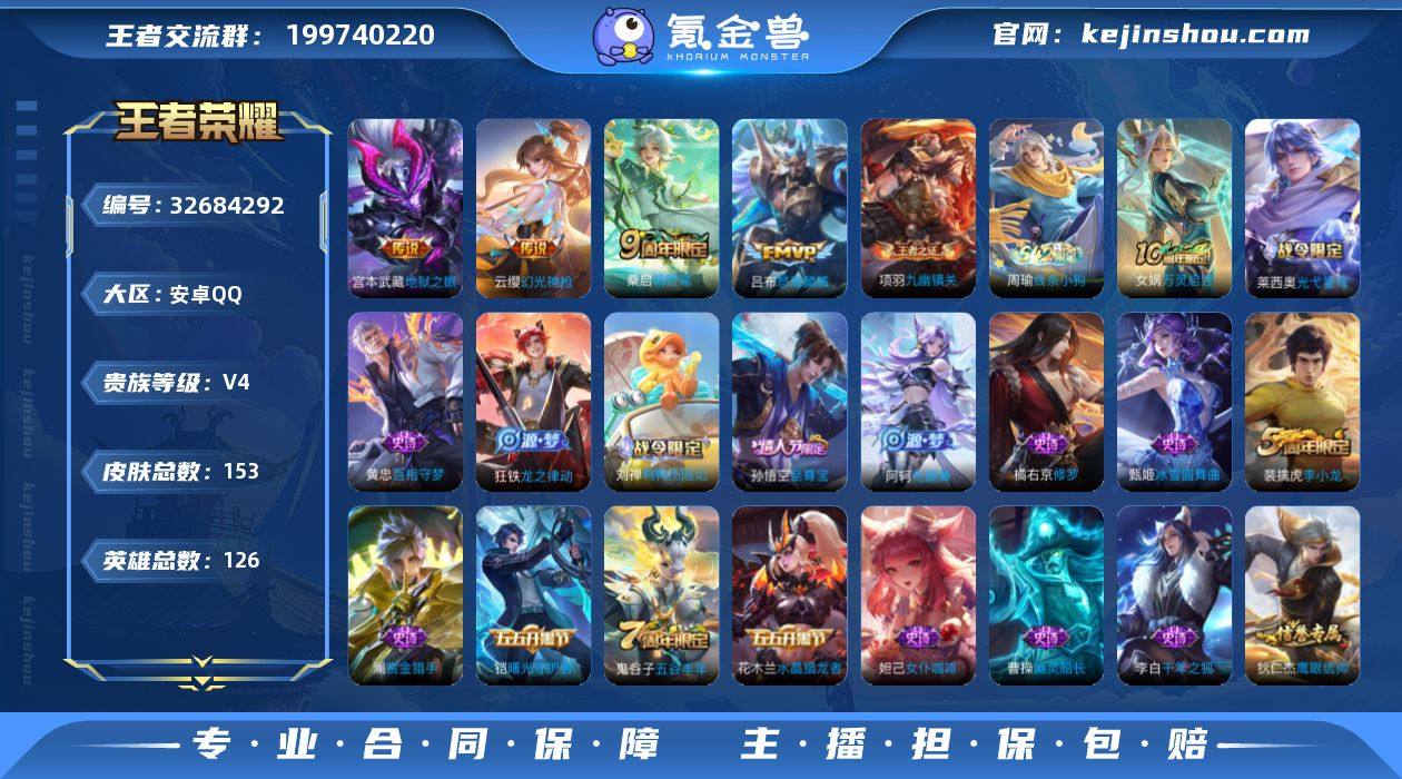 安卓Q-V4-至尊星耀II段位-126英雄-153皮肤-4传说-36史诗 【传说皮肤】:云缨幻光神枪,桑启鸣野蒿,吕布怒海麟威,宫本武藏地狱之眼 【限定皮肤】:姜子牙天穹之誓,杨戬破阵退雄兵,狄仁杰阴阳师,赵云皇家上将,孙尚香蔷薇恋人,项羽海滩派对,孙悟空至尊宝,李元芳云中旅人,鬼谷子五谷丰年,百里玄策原初追逐者,裴擒虎李小龙,裴擒虎擒涛扼浪,鲁班大师探海日志,桑启海盐诗旅,阿古朵江河有灵,张良古海寻踪,鬼谷子天穹祈灯,沈梦溪龙舞盛年,李元芳蔬乡物语,刘邦剑破天穹,程咬金群星魔术团,周瑜熔金海岸 【赛季限定】:李元芳云中旅人,桑启海盐诗旅,裴擒虎擒涛扼浪,鲁班大师探海日志,张良古海寻踪,鬼谷子天穹祈灯,刘邦剑破天穹,姜子牙天穹之誓,东皇太一噬灭天穹,太乙真人谧流熔炉,钟馗虚灵犬护,甄姬逆浪荇歌,亚瑟荣光之誓,百里玄策原初追逐者,牛魔星界战将,项羽九幽镇关 【战令限定】:李元芳蔬乡物语,刘禅鸭鸭历险记,沈梦溪鸭鸭历险记,莱西奥光弋星穹,明世隐往忆晖光,周瑜线条小狗 【史诗皮肤】:周瑜线条小狗,项羽九幽镇关,女娲万灵启世,莱西奥光弋星穹,黄忠百相守梦,狂铁龙之律动,刘禅鸭鸭历险记,阿轲化蝶舞,弈星万物之道,牛魔星...