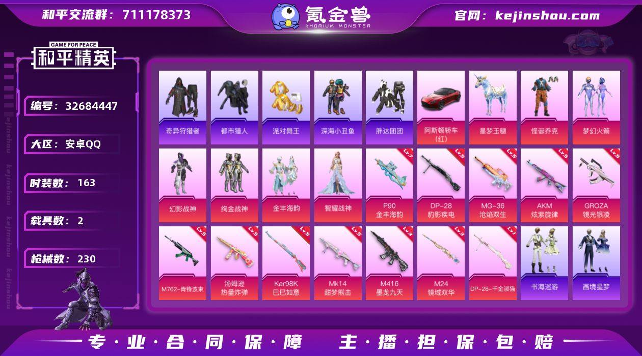 安卓 手Q-6粉装-20特效枪-2载具-6粉色飞行器-71260热力值-8王牌印记-163套装-230枪皮 【热门品类】:粉装-怪诞乔克,粉装-梦幻火箭,套装-浪漫天命,套装-都市猎人,套装-派对舞王,套装-深海小丑鱼,套装-小丑鱼,套装-奇异狩猎者,套装-胖达团团,套装-忍者信条,套装-潮萌小黄鸭,套装-暗影哥特,角色-Mark.06 【粉色套装】:粉装-幻影战神,粉装-怪诞乔克,粉装-梦幻火箭,粉装-绚金战神,粉装-金丰海韵,角色-智耀战神 【粉色枪皮等级】:AKM-炫紫旋律(五级),M416-墨龙九天(三级),GROZA-镜光银凌(五级),AUG-花中眠(三级),M762-青锋波束(五级),ACE32-萌骑漫游(二级),UMP45-萌骑冒险(二级),汤姆逊-热量炸弹(五级),AKS-74U-森灵之息(五级),P90-金丰海韵(七级),Kar98K-巳巳如意(五级),M24-镜域双华(三级),Mk14-甜梦熊击(五级),Mk14-福马献瑞(五级),AA12-G-萌骑幻想(一级),DP-28-千金淑猫(一级),DP-28-豹影疾电(五级),PKM-萌骑夺宝(一级),MG-36-沧焰双生(五级),信号枪-金乌曜日(一级) 【粉色载具】:阿斯顿马丁DBS(红),星梦玉骢 【粉色枪皮】:AKM-炫紫旋律,M416-墨龙九天,GROZA-镜光银凌,AUG-花中眠,M762-青锋波束,ACE32-萌骑漫游,UMP45-萌骑冒...