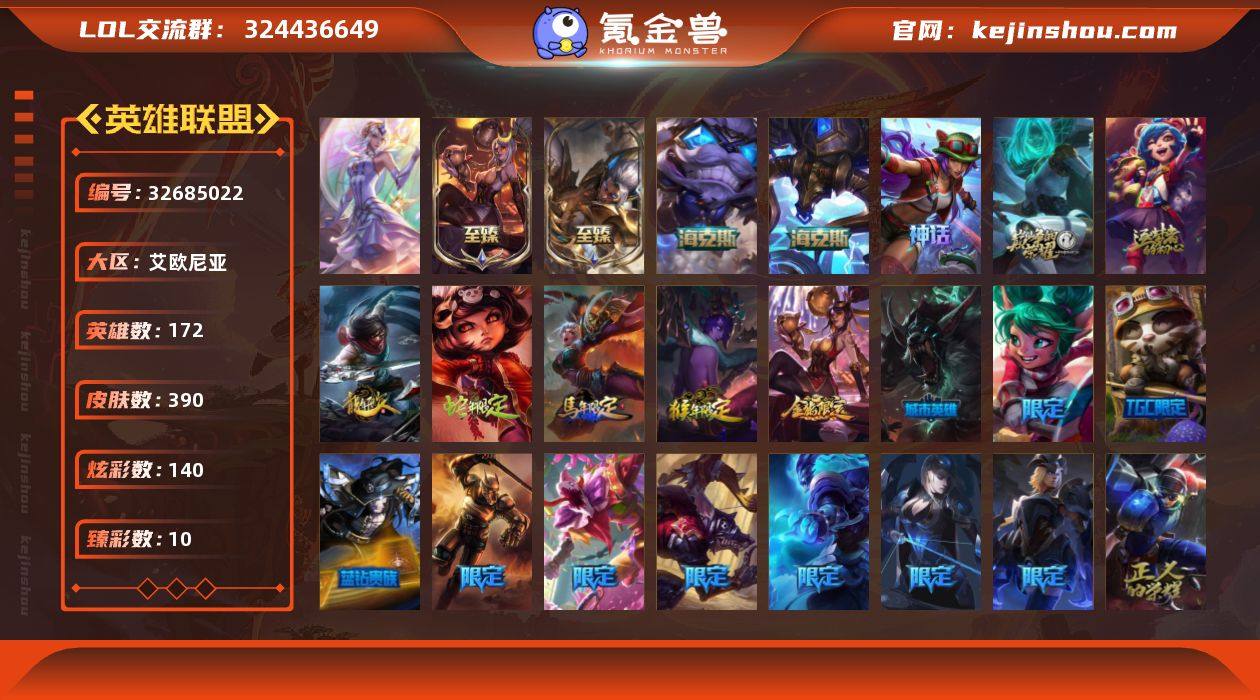 【940824】未定级段位-172英雄-390皮肤-140炫彩-1终极-7神话-52限定-25传说-100史诗 【珍稀头像】:至爱的鹿头像 【神话皮肤】:十周年纪念安妮,源代码乐芙兰,十五周年纪念希维尔 【至臻皮肤】:至臻烈焰美人薇恩,至臻神龙尊者炎龙瑟提 【海克斯皮肤】:海克斯科技阿利斯塔,海克斯科技吉格斯 【臻彩皮肤】:天龙之子卡莎飞龙乘云,无畏骑士瑟庄妮赤子初心,替父从军花木兰炫金龙刃,西部魔影卢锡安贝利尔之怠,幻灵战斗蝠薇恩梦幻强袭,玉剑传说寒潭夭夭胭脂,魔女阿卡丽虚荣,净雪之月莫甘娜冬虹,红莲之刃锐雯 【年限皮肤】:银龙裁决泰隆,你看见过我的熊猫吗安妮,替父从军花木兰,紫金罗刹莫甘娜,烈焰美人薇恩 【冰雪限定】:幸福女神乐芙兰,圣诞开心鬼提莫,圣诞精灵崔丝塔娜,阿木木“主人不要我了”,英勇玩具兵普朗克,冬季仙境奥莉安娜,雪默丁格,圣诞玩偶波比,圣诞老人古拉加斯,魄罗骑士瑟庄妮 【终极皮肤】:大元素使拉克丝 【限定皮肤】:哥特萝莉安妮,冠军典狱长锤石,冠军之血希瓦娜,冠军之箭艾希,Fnatic迦娜,Fnatic嘉文四世,暗杀星伊泽瑞尔,SSW锤石,iG乐芙兰,电玩勇者锐雯,电玩女神阿狸,胜利女神希维尔,胜利枪神格雷福斯,胜利女神奥莉安娜...