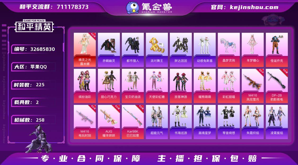 苹果 【红装号 精灵之光-露米娜(三级)/粉装-怪诞乔克/粉装-缤纷油彩/套装-赤蝎幽灵/套装-都市猎人/套装-派对舞王/套装-暗影哥特/蓝螳螂/粉装-放客神游/M416-风花雪月(七级)/M416-电玩时刻(五级)/AUG-暖羊咩咩(五级)】手Q-1神装-13粉装-10特效枪-2载具-6粉色飞行器-88136热力值-17王牌印记-225套装-258枪皮 【红色神装等级】:精灵之光-露米娜(三级) 【红色角色神装】:精灵之光-露米娜 【热门品类】:粉装-怪诞乔克,粉装-缤纷油彩,套装-浪漫天命,套装-赤蝎幽灵,套装-都市猎人,套装-派对舞王,套装-小丑鱼,套装-胖达团团,套装-动感兔斯基人偶服,套装-龟仙人,套装-潮萌小黄鸭,套装-暗影哥特,套装-粉红小猪,套装-糯粉咩咩,角色-8号机,角色-Mark.06,套装-红熊茄茄 【粉色套装】:粉装-怪诞乔克,粉装-甜心巧克力,粉装-宝贝奶油派,粉装-天使彩虹糖,粉装-缤纷油彩,粉装-放客神游,粉装-暖熊萌萌,粉装-彩虹甜喵,角色-羊梦糖心,角色-虹云熊熊,人物-小舞·灵珑,人物-小舞·雪昙,人物-小舞·恋语 【粉色枪皮等级】:SCAR-L-灵驹仙姬(三级),M416-风花雪月(七级),M416-电玩时刻(五级),AUG-暖羊咩咩(五级),UMP45-萌骑冒险(五级),AKS-74U-森灵之息(五级),Kar98K...