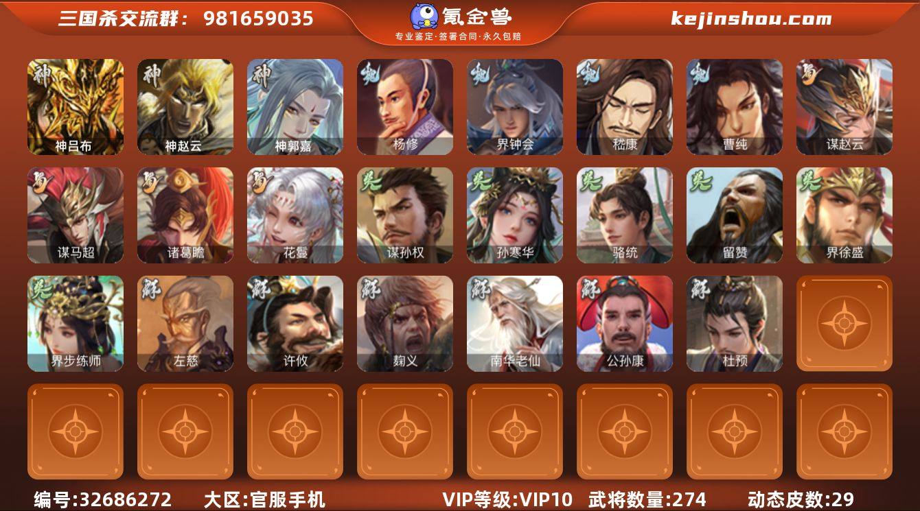 【1329】官阶:骠骑将军;VIP等级:VIP10;史诗武将数量:25;动态皮肤数量:29;武将总数:274;史诗宝珠数量:0;将魂数量:81;神将:4;魏国史诗武将:6;蜀国史诗武将:4;吴国史诗武将:6;群史诗武将:7 神吕布,神赵云,神郭嘉,神吕蒙,杨修,界钟会,嵇康,曹纯,谋赵云,谋马超,诸葛瞻,花鬘,孙寒华,骆统,留赞,界徐盛,界步练师,谋孙权,左慈,麹义,南华老仙,公孙康,杜预,张绣,许攸,神郭嘉-虎年清明(动态),神郭嘉-倚星折月(动态),神吕布-冠绝天下(动态),钟会-潜蛟觊天(动态),曹丕-气荡山河(动态),星周不疑-龙年清明(动态),刘备-龙御天下(动态),诸葛亮-龙年限定(动态),小乔-兔年七夕(动态),孙策-兔年中秋(动态),周处-义除三害(动态),孙权-永开吴祚(动态),孙权-牛年七夕(动态),孙尚香-兔年春节(动态),孙尚香-星流霆击(动态),大乔-猪年七夕(动态),界大乔-猪年七夕(动态),界孙权-牛年七夕(动态),界孙尚香-星流霆击(动态),徐盛-破军杀将(动态),灵雎-霜刃绚练(动态),杜预-弼朝博虬(动态),吕布-虓虎之勇(动态),界吕布-虓虎之勇(动态)