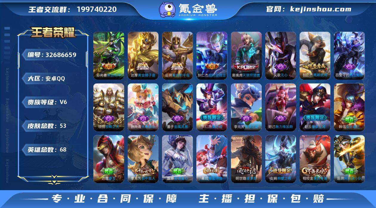 【WZ181755】安卓Q-V6-荣耀黄金II段位-68英雄-53皮肤-4传说-11史诗【传说皮肤】:达摩黄金狮子座,后羿黄金射手座,孙尚香末日机甲,狄仁杰超时空战士【限定皮肤】:狄仁杰阴阳师,赵云皇家上将,周瑜赤莲之焰,元歌无心,狄仁杰魔术师,狄仁杰万华元夜,达摩沙漠行僧,项羽海滩派对,程咬金演武夺筹,兰陵王金庭之子,李元芳云中旅人,钟馗驱傩正仪,女娲朔望之晖,鬼谷子原初探秘者,弈星混沌棋,沈梦溪大漠名商,明世隐疑决卦,裴擒虎天狼狩猎者,桑启海盐诗旅【赛季限定】:弈星混沌棋,明世隐疑决卦,鬼谷子原初探秘者,狄仁杰万华元夜,程咬金演武夺筹,钟馗驱傩正仪,达摩沙漠行僧,兰陵王金庭之子,沈梦溪大漠名商,李元芳云中旅人,桑启海盐诗旅【战令限定】:女娲朔望之晖,周瑜赤莲之焰【史诗皮肤】:元歌无心,狄仁杰鹰眼统帅,裴擒虎天狼狩猎者,李元芳逐浪之夏,百里守约特工魅影,墨子金属风暴,妲己魅力维加斯,孙尚香水果甜心,狄仁杰魔术师,赵云皇家上将,项羽苍穹之光【其他皮肤】:桑启海盐诗旅,李元芳云中旅人,沈梦溪大漠名商,兰陵王金庭之子,达摩沙漠行僧,鲁班大师乓乓大师,钟馗驱傩正仪,程咬金演武夺筹,露娜瓷语鉴心,狄仁杰万华元夜,鬼谷子...