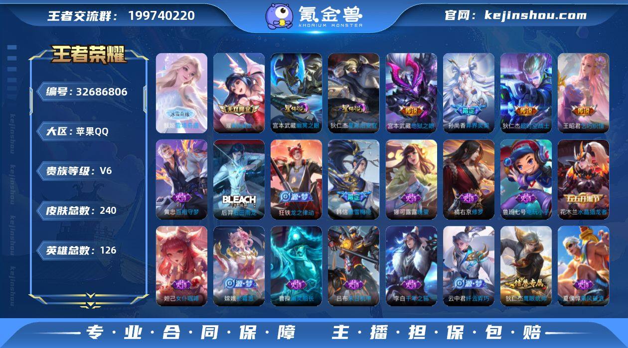 境奇遇天幕·无相·雪境奇遇·真我赫兹·孙尚香异界灵契·乞巧织情·无二次包过】w21309-苹果Q-126英雄-240皮肤-18王者印记-292铭文-贵族积分1w【贵族6】【3无双·2星传说·6传说·2天幕·13按键】【因赛季更新游戏段付以上号为准!】 【英雄全皮】:孙权全皮 【无双皮肤】:孙悟空无相,甄姬雪境奇遇,瑶真我赫兹 【星元皮肤】:狄仁杰星际治安官,宫本武藏幽冥之眼 【天幕】:雪境奇遇天幕,共赏芳华天幕 【传说皮肤】:后羿神树通天,桑启鸣野蒿,孙尚香异界灵契,王昭君乞巧织情,宫本武藏地狱之眼,狄仁杰超时空战士 【限定皮肤】:蒙犽顽岩魄,大乔绒语心约,姜子牙天穹之誓,狄仁杰阴阳师,赵云皇家上将,孙尚香蔷薇恋人,孙尚香异界灵契,庄周高山流水,元歌无心,夏侯惇朔风刀,狄仁杰魔术师,狄仁杰万华元夜,达摩沙漠行僧,项羽海滩派对,程咬金演武夺筹,韩信傲雪梅枪,兰陵王金庭之子,李元芳云中旅人,钟馗驱傩正仪,哪吒逐梦之翼,雅典娜黎明之约,鬼谷子原初探秘者,鬼谷子五谷丰年,苏烈千军破阵,百里玄策原初追逐者,弈星混沌棋,梦奇顽趣,沈梦溪大漠名商,明世隐疑决卦,裴擒虎李小龙,裴擒虎擒涛扼浪,云中君纤云弄巧,上官婉儿梁祝,嫦娥拒霜思,鲁班大师探海日志...