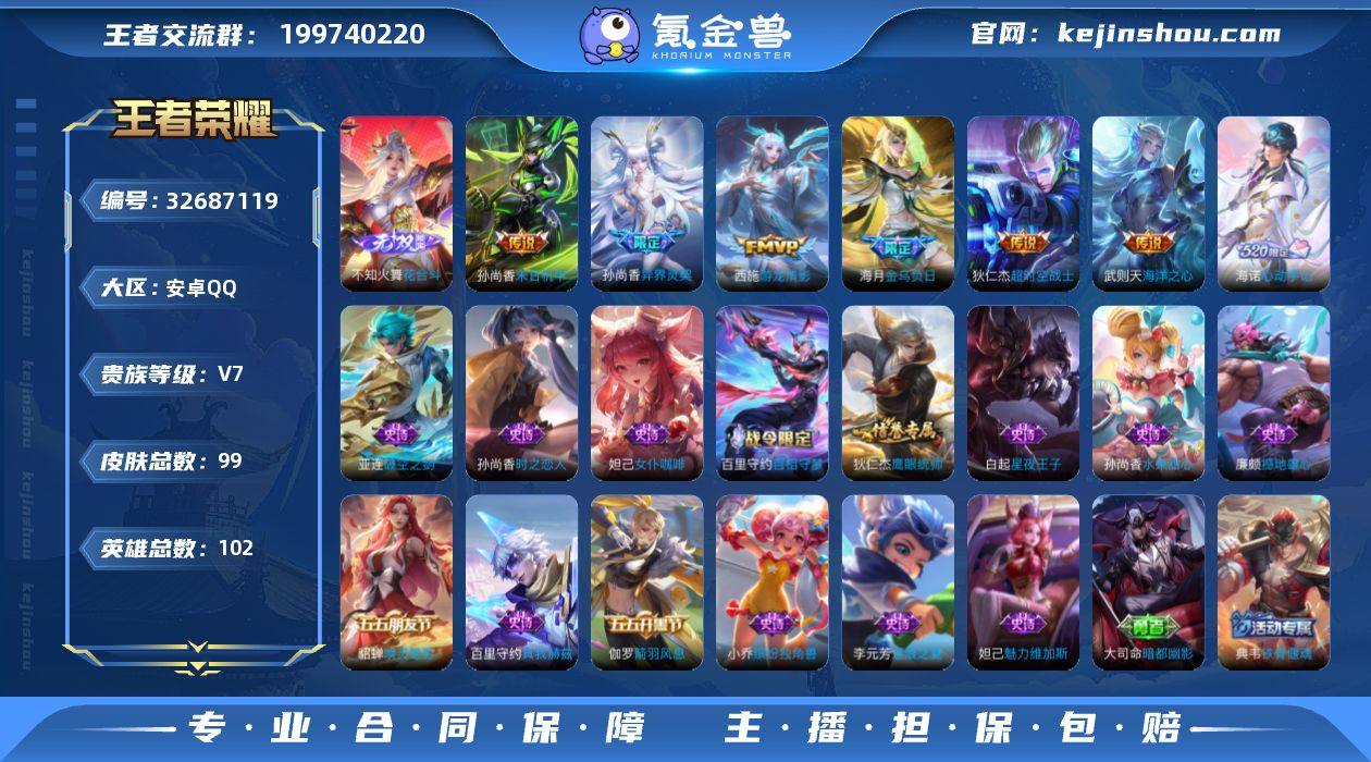【高性价比·武则天英雄·花合斗·问心剑·金乌负日·孙尚香异界灵契·可二次】w21393-安卓Q-102英雄-99皮肤-4王者印记-73铭文-贵族积分3w【贵族7】【1典藏·2无双·7传说·14按键】【因赛季更新游戏段付以上号为准!】 【英雄全皮】:孙权全皮 【荣耀典藏】:武则天英雄 【无双皮肤】:李信问心剑,不知火舞花合斗 【传说皮肤】:桑启鸣野蒿,海月金乌负日,孙尚香异界灵契,西施游龙清影,孙尚香末日机甲,武则天海洋之心,狄仁杰超时空战士 【限定皮肤】:蔡文姬夏日便利店,大乔绒语心约,虞姬夏日便利店,姜子牙天穹之誓,狄仁杰阴阳师,赵云皇家上将,孙尚香异界灵契,甄姬落雪兰心,狄仁杰魔术师,项羽海滩派对,西施玲珑珍味,西施至美乘鲤谣,艾琳流音漫舞,鬼谷子天穹祈灯,沈梦溪龙舞盛年,海月金乌负日,刘邦剑破天穹,程咬金群星魔术团,镜青焰无极,项羽苍威无极,海诺心动手记,周瑜熔金海岸,不知火舞花合斗 【赛季限定】:鬼谷子天穹祈灯,刘邦剑破天穹,姜子牙天穹之誓,东皇太一噬灭天穹,太乙真人谧流熔炉,钟馗虚灵犬护 【战令限定】:甄姬落雪兰心,西施玲珑珍味,艾琳流音漫舞,镜青焰无极,项羽苍威无极,蔡文姬夏日便利店,虞姬夏日便利店,亚连破空之剑,廉颇...