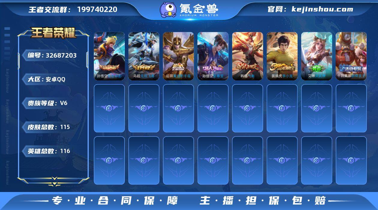 安卓Q 可二次 1典藏3传说116英雄115皮肤 全息碎影 逐花归海 无双飞将 黄金射手座 万灵启世 至尊宝 飞衡 冰冠公主 暗夜猫娘 龙骑士 星界特工 原初探秘者 李小龙 猫狗日记男 特工魅影 女武神 胡桃夹子 舞动绿茵 逐浪之夏 白龙吟 千年之狐 幽灵船长 末日机甲男 偶像歌手 箭羽风息 鬼剑武藏 穷奇 御銮 混沌棋 疑决卦 醍醐杖 万华元夜 演武夺筹 驱傩正仪 未来纪元赵云 拳王 沙漠行僧 金庭之子 王者荣耀账号